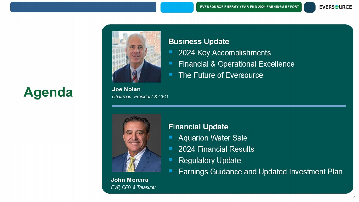 EVERSOURCE ENERGY YEAR END 2024 EARNINGS REPORT Agenda Business Update ▪ 2024 Key Accomplishments ▪ Financial & Operational Excellence ▪ The Future of Eversource 2 Joe Nolan Chairman, President & CEO John Moreira EVP, CFO & Treasurer Financial Update ▪ Aquarion Water Sale ▪ 2024 Financial Results ▪ Regulatory Update ▪ Earnings Guidance and Updated Investment Plan