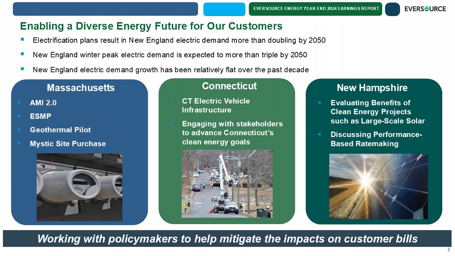 EVERSOURCE ENERGY YEAR END 2024 EARNINGS REPORT 2024 Accomplishments HIGHLIGHTS ▪ Closed 2024 with 5.3% recurring EPS growth ▪ Maintained top decile performance for reliability ▪ Advanced Clean Energy initiatives in MA – ESMP, Geothermal pilot, EV infrastructure ▪ Acquired Mystic Property (Everett, MA) with potential for energy hub ▪ Implemented new customer billing and information system to support AMI in MA – meter installations begin in 2025 ▪ Filed for rate case requests for PSNH and Yankee Gas AND MORE ▪ Completed exit from offshore wind business ▪ Signed agreement to sell water business ▪ Reaffirming long - term growth rate of 5 - 7% through 2029 off 2024 base 4 Ranked as the #1 U.S. utility in TIME’s World’s Best Companies Named among America’s Most Responsible Companies for sixth straight year by Newsweek