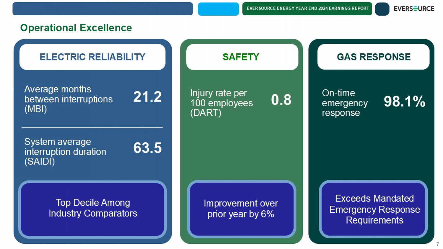 EVERSOURCE ENERGY YEAR END 2024 EARNINGS REPORT Financial Excellence 6 $4.09 $4.34 $4.57 $4.67 - $4.82 2022 2023 2024 2025 Estimate * * Recurring EPS estimate represents Eversource’s EPS guidance for the full year 2025. $2.55 $2.70 $2.86 $3.01 2022 2023 2024 2025 Recurring EPS Dividends Per Share Estimate