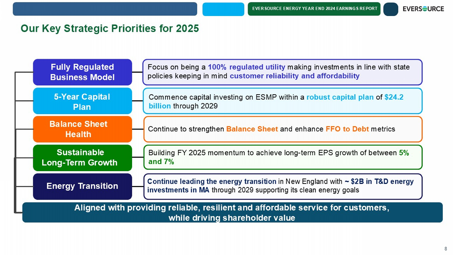 EVERSOURCE ENERGY YEAR END 2024 EARNINGS REPORT Aligned with providing reliable, resilient and affordable service for customers, while driving shareholder value Our Key Strategic Priorities for 2025 Building FY 2025 momentum to achieve long - term EPS growth of between 5% and 7% Fully Regulated Business Model Balance Sheet Health Energy Transition Focus on being a 100% regulated utility making investments in line with state policies keeping in mind customer reliability and affordability Continue to strengthen Balance Sheet and enhance FFO to Debt metrics Continue leading the energy transition in New England with ~ $2B in T&D energy investments in MA through 2029 supporting its clean energy goals 5 - Year Capital Plan Commence capital investing on ESMP within a robust capital plan of $24.2 billion through 2029 Sustainable Long - Term Growth 8