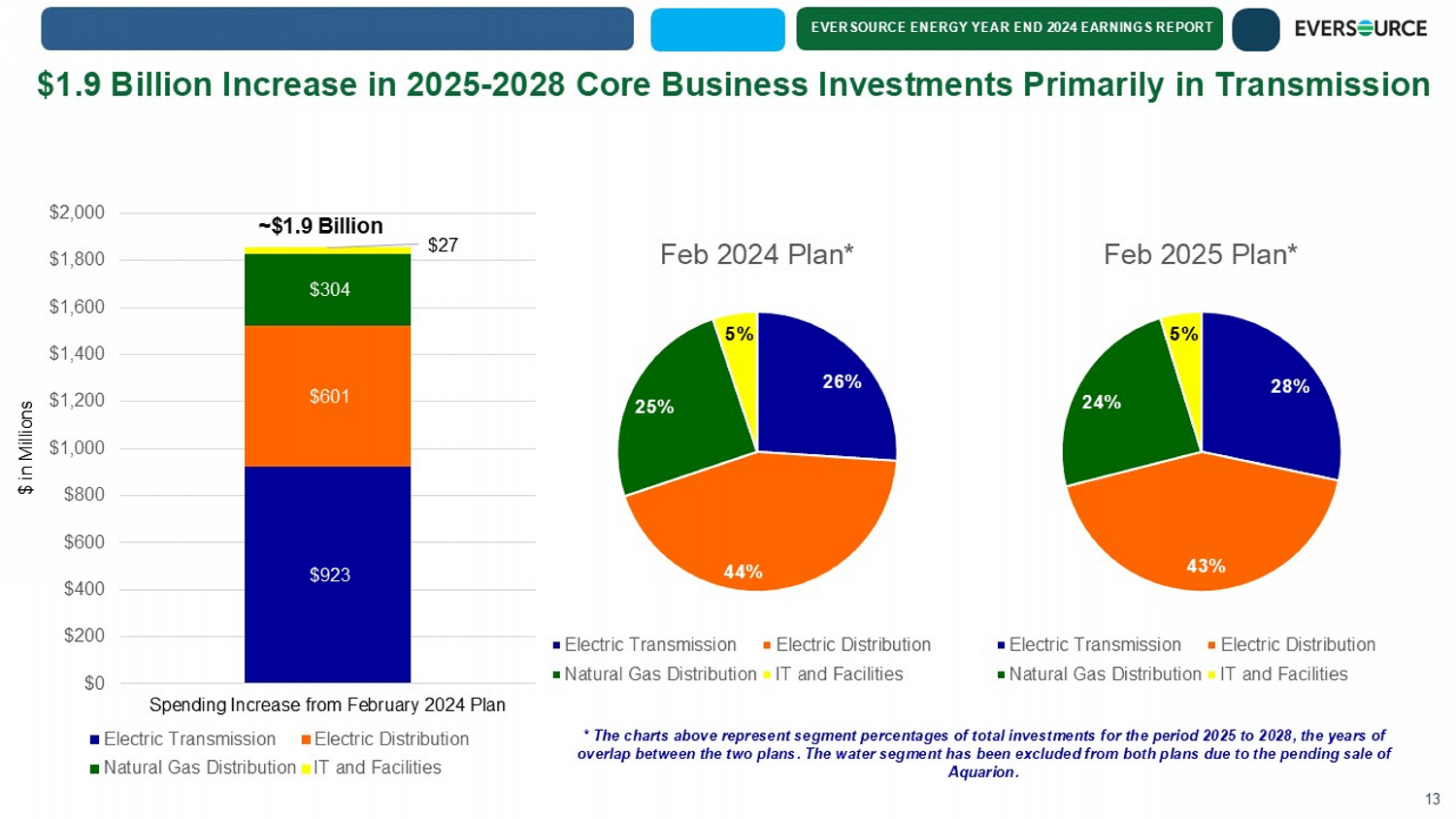 EVERSOURCE ENERGY YEAR END 2024 EARNINGS REPORT Regulatory Progress Massachusetts ▪ EGMA Rate Base Reset for rates effective November 1, 2024 – Approved November 7, 2024 ▪ NSTAR Gas PBR adjustment for rates effective November 1, 2024 – Approved October 30, 2024 ▪ NSTAR Electric PBR adjustment for rates effective January 1, 2025 – Approved by MA DPU on December 23, 2024 New Hampshire ▪ Filed a request for Rate Review in June 2024 – Settlement agreement for $61 million of interim rates implemented August 1, 2024 – Final decision expected in 2025 for rates effective August 1, 2025 Connecticut ▪ Yankee Gas Rate Case Filing – Filed rate case in November 2024 with PBR proposal ▪ AMI Cost Recovery – Motion for Reconsideration granted ▪ Storm Cost Prudency Review – Filed for prudency review of $807 million of prior years’ storm costs 12