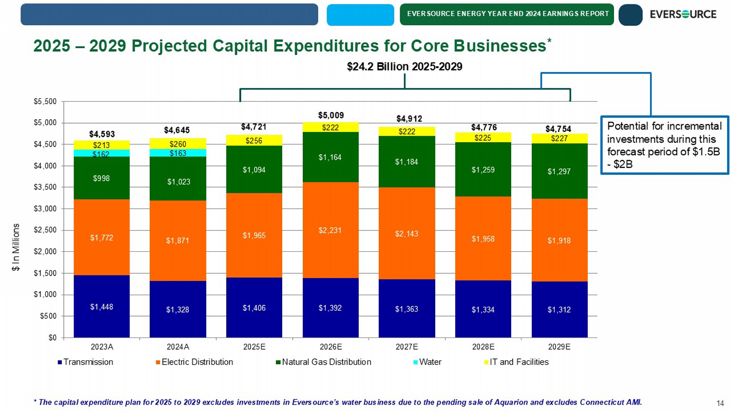 EVERSOURCE ENERGY YEAR END 2024 EARNINGS REPORT $ in Millions $1.9 Billion Increase in 2025 - 2028 Core Business Investments Primarily in Transmission 13 26% 44% 25% 5% Feb 2024 Plan* Electric Transmission Electric Distribution Natural Gas Distribution IT and Facilities 28% 43% 24% 5% Feb 2025 Plan* Electric Transmission Electric Distribution Natural Gas Distribution IT and Facilities $923 $601 $304 $27 $0 $200 $400 $600 $800 $1,000 $1,200 $1,400 $1,600 $1,800 $2,000 Spending Increase from February 2024 Plan Electric Transmission Electric Distribution Natural Gas Distribution IT and Facilities ~$1.9 Billion * The charts above represent segment percentages of total investments for the period 2025 to 2028, the years of overlap between the two plans. The water segment has been excluded from both plans due to the pending sale of Aquarion.