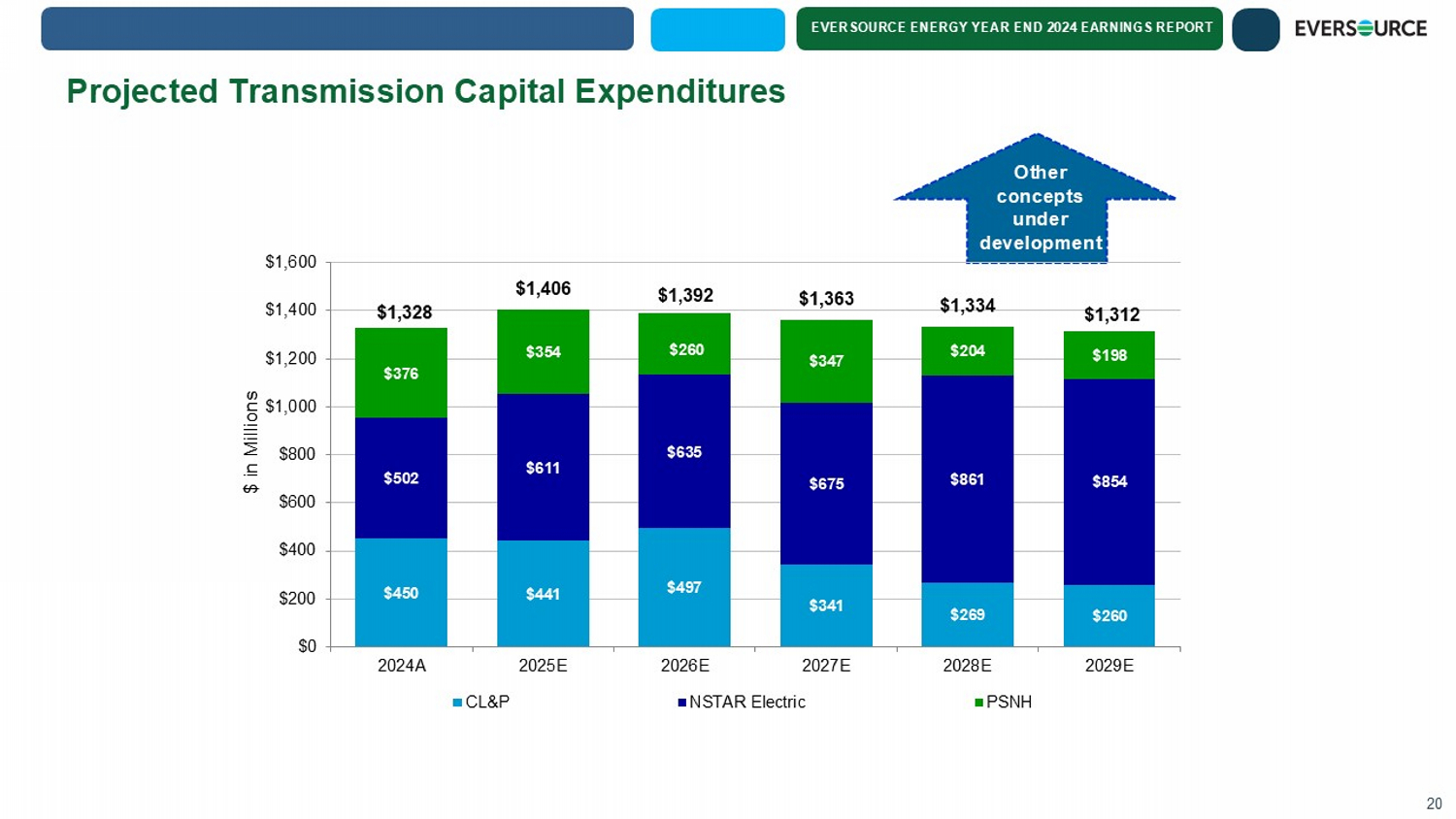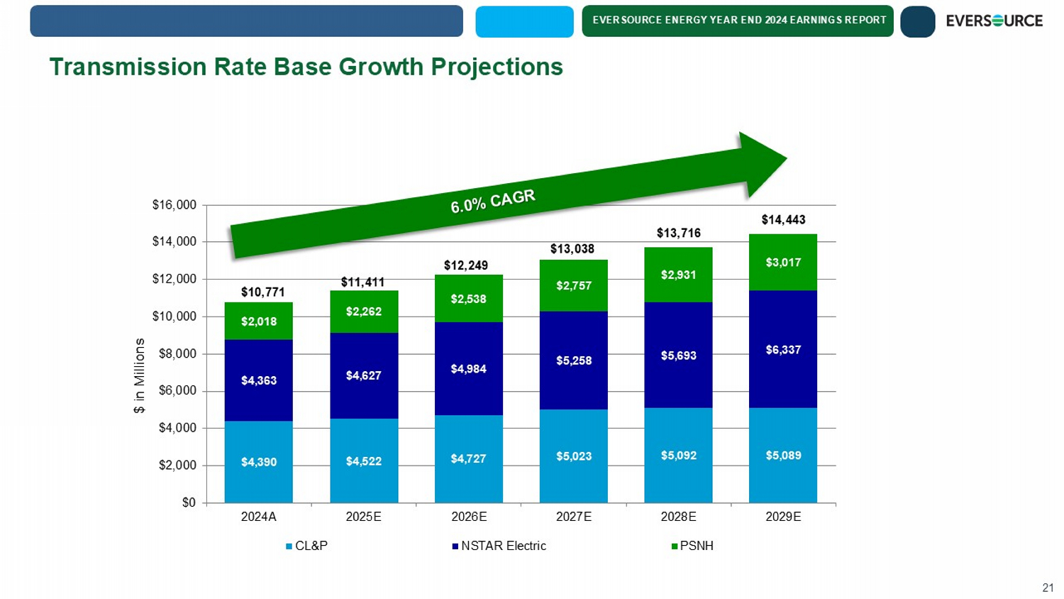 EVERSOURCE ENERGY YEAR END 2024 EARNINGS REPORT $450 $441 $497 $341 $269 $260 $502 $611 $635 $675 $861 $854 $376 $354 $260 $347 $204 $198 $1,328 $1,406 $1,392 $1,363 $1,334 $1,312 $0 $200 $400 $600 $800 $1,000 $1,200 $1,400 $1,600 2024A 2025E 2026E 2027E 2028E 2029E CL&P NSTAR Electric PSNH $ in Millions Other concepts under development Projected Transmission Capital Expenditures 20