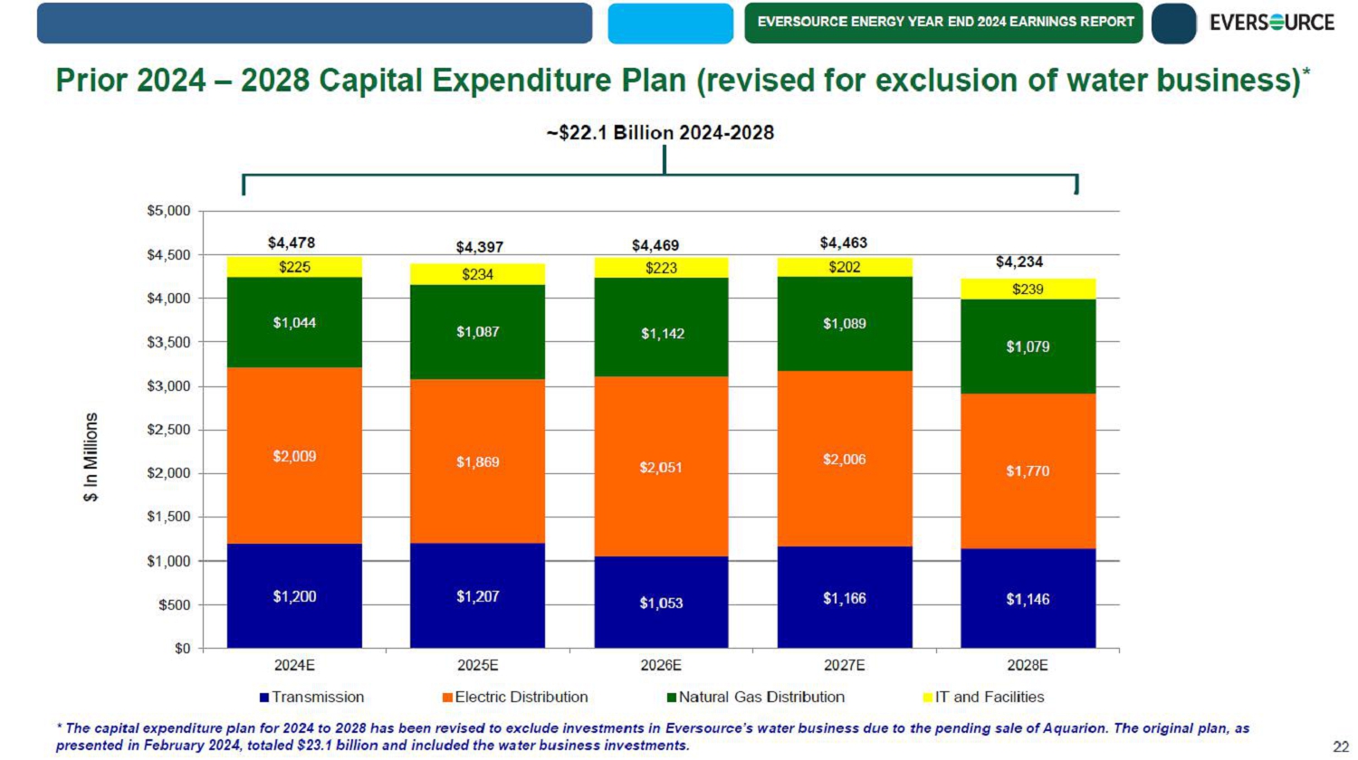 EVERSOURCE ENERGY YEAR END 2024 EARNINGS REPORT $1,200 $1,207 $1,053 $1,166 $1,146 $2,009 $1,869 $2,051 $2,006 $1,770 $1,044 $1,087 $1,142 $1,089 $1,079 $225 $234 $223 $202 $239 $0 $500 $1,000 $1,500 $2,000 $2,500 $3,000 $3,500 $4,000 $4,500 $5,000 2024E 2025E 2026E 2027E 2028E Transmission Electric Distribution Natural Gas Distribution IT and Facilities $ In Millions ~$22.1 Billion 2024-2028 Prior 2024 - 2028 Capital Expenditure Plan (revised for exclusion of water business)* 22 $4,478 $4,397 $4,469 $4,463 $4,234 * The capital expenditure plan for 2024 to 2028 has been revised to exclude investments in Eversource's water business due to the pending sale of Aquarion. The original plan, as presented in February 2024, totaled $23.1 billion and included the water business investments.