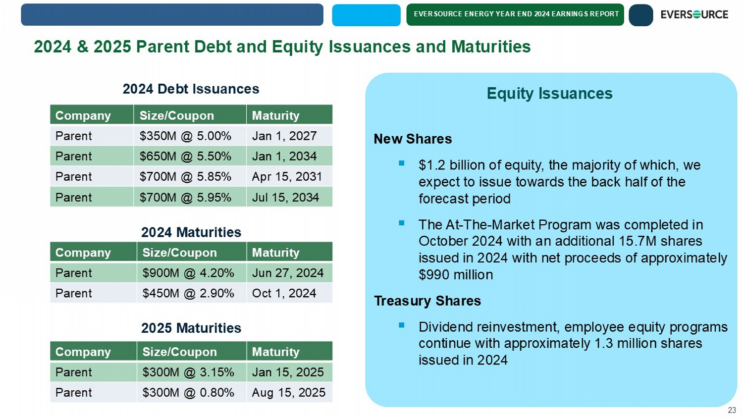 EVERSOURCE ENERGY YEAR END 2024 EARNINGS REPORT 2024 & 2025 Parent Debt and Equity Issuances and Maturities 23 Maturity Size/Coupon Company Jun 27, 2024 $900M @ 4.20% Parent Oct 1, 2024 $450M @ 2.90% Parent 2024 Debt Issuances 2024 Maturities Maturity Size/Coupon Company Jan 1, 2027 $350M @ 5.00% Parent Jan 1, 2034 $650M @ 5.50% Parent Apr 15, 2031 $700M @ 5.85% Parent Jul 15, 2034 $700M @ 5.95% Parent New Shares ▪ $1.2 billion of equity, the majority of which, we expect to issue towards the back half of the forecast period ▪ The At - The - Market Program was completed in October 2024 with an additional 15.7M shares issued in 2024 with net proceeds of approximately $ 990 million Treasury Shares ▪ Dividend reinvestment, employee equity programs continue with approximately 1.3 million shares issued in 2024 Equity Issuances 2025 Maturities Maturity Size/Coupon Company Jan 15, 2025 $300M @ 3.15% Parent Aug 15, 2025 $300M @ 0.80% Parent