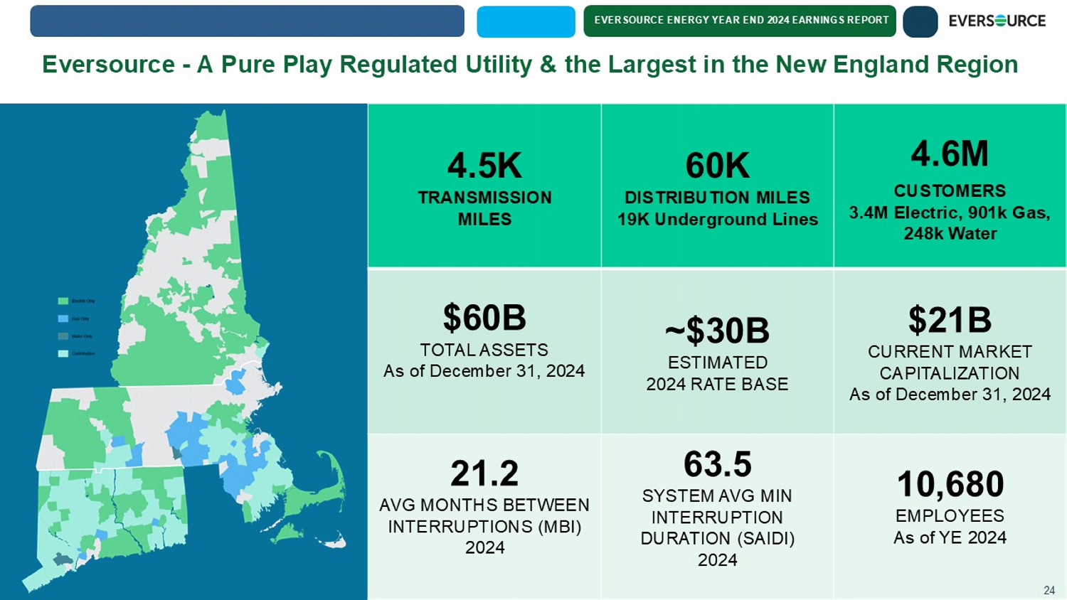 EVERSOURCE ENERGY YEAR END 2024 EARNINGS REPORT Eversource - A Pure Play Regulated Utility & the Largest in the New England Region 24 4.6M CUSTOMERS 3.4M Electric, 901k Gas, 248k Water 60K DISTRIBUTION MILES 19K Underground Lines 4.5K TRANSMISSION MILES $21B CURRENT MARKET CAPITALIZATION As of December 31, 2024 ~$30B ESTIMATED 2024 RATE BASE $60B TOTAL ASSETS As of December 31, 2024 10,680 EMPLOYEES As of YE 2024 63.5 SYSTEM AVG MIN INTERRUPTION DURATION (SAIDI) 2024 21.2 AVG MONTHS BETWEEN INTERRUPTIONS (MBI) 2024 24