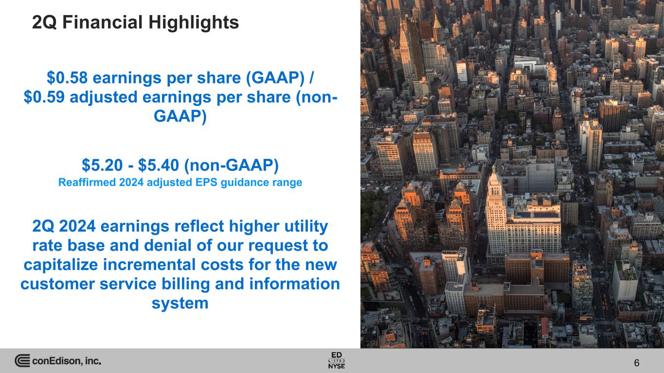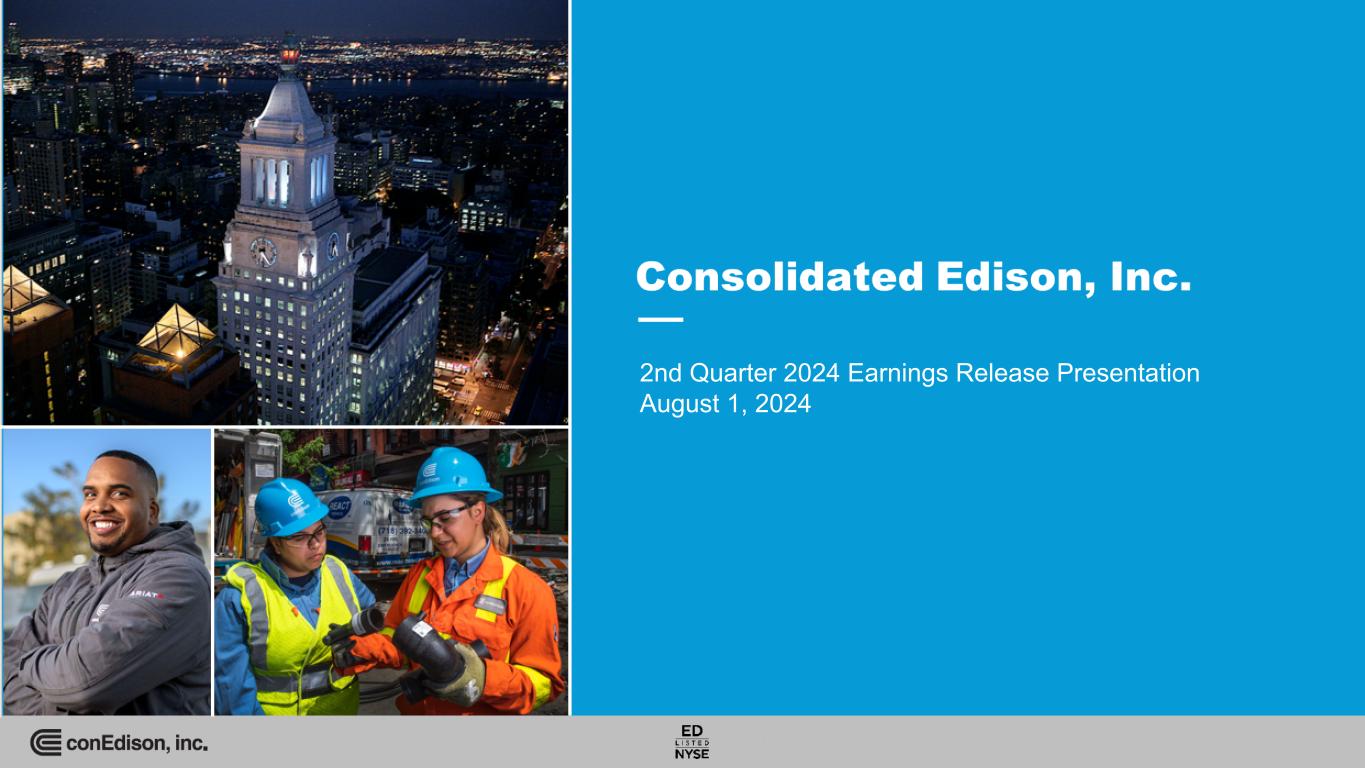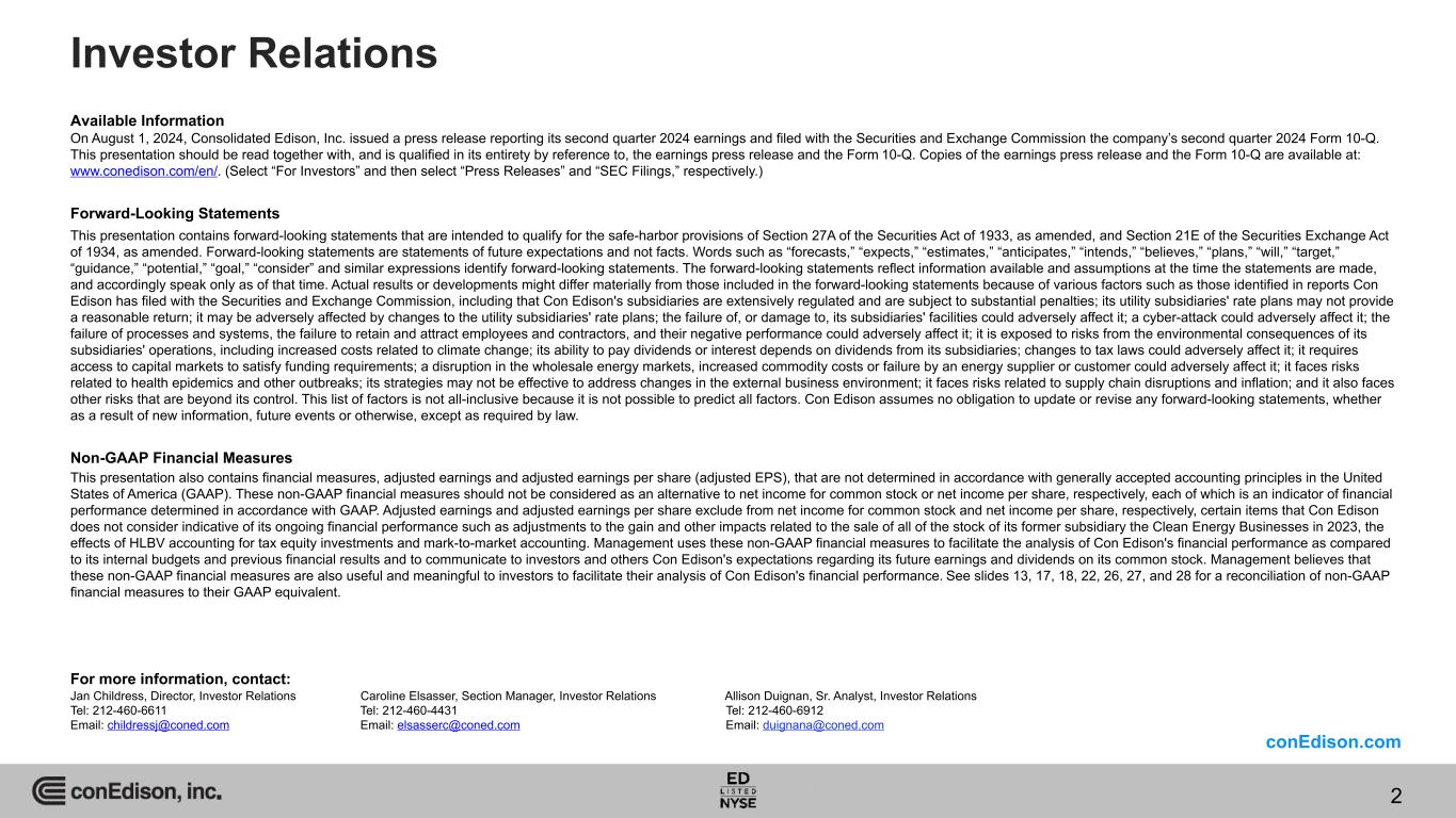 Available Information On August 1, 2024, Consolidated Edison, Inc. issued a press release reporting its second quarter 2024 earnings and filed with the Securities and Exchange Commission the company’s second quarter 2024 Form 10-Q. This presentation should be read together with, and is qualified in its entirety by reference to, the earnings press release and the Form 10-Q. Copies of the earnings press release and the Form 10-Q are available at: www.conedison.com/en/. (Select “For Investors” and then select “Press Releases” and “SEC Filings,” respectively.) Forward-Looking Statements This presentation contains forward-looking statements that are intended to qualify for the safe-harbor provisions of Section 27A of the Securities Act of 1933, as amended, and Section 21E of the Securities Exchange Act of 1934, as amended. Forward-looking statements are statements of future expectations and not facts. Words such as “forecasts,” “expects,” “estimates,” “anticipates,” “intends,” “believes,” “plans,” “will,” “target,” “guidance,” “potential,” “goal,” “consider” and similar expressions identify forward-looking statements. The forward-looking statements reflect information available and assumptions at the time the statements are made, and accordingly speak only as of that time. Actual results or developments might differ materially from those included in the forward-looking statements because of various factors such as those identified in reports Con Edison has filed with the Securities and Exchange Commission, including that Con Edison's subsidiaries are extensively regulated and are subject to substantial penalties; its utility subsidiaries' rate plans may not provide a reasonable return; it may be adversely affected by changes to the utility subsidiaries' rate plans; the failure of, or damage to, its subsidiaries' facilities could adversely affect it; a cyber-attack could adversely affect it; the failure of processes and systems, the failure to retain and attract employees and contractors, and their negative performance could adversely affect it; it is exposed to risks from the environmental consequences of its subsidiaries' operations, including increased costs related to climate change; its ability to pay dividends or interest depends on dividends from its subsidiaries; changes to tax laws could adversely affect it; it requires access to capital markets to satisfy funding requirements; a disruption in the wholesale energy markets, increased commodity costs or failure by an energy supplier or customer could adversely affect it; it faces risks related to health epidemics and other outbreaks; its strategies may not be effective to address changes in the external business environment; it faces risks related to supply chain disruptions and inflation; and it also faces other risks that are beyond its control. This list of factors is not all-inclusive because it is not possible to predict all factors. Con Edison assumes no obligation to update or revise any forward-looking statements, whether as a result of new information, future events or otherwise, except as required by law. Non-GAAP Financial Measures This presentation also contains financial measures, adjusted earnings and adjusted earnings per share (adjusted EPS), that are not determined in accordance with generally accepted accounting principles in the United States of America (GAAP). These non-GAAP financial measures should not be considered as an alternative to net income for common stock or net income per share, respectively, each of which is an indicator of financial performance determined in accordance with GAAP. Adjusted earnings and adjusted earnings per share exclude from net income for common stock and net income per share, respectively, certain items that Con Edison does not consider indicative of its ongoing financial performance such as adjustments to the gain and other impacts related to the sale of all of the stock of its former subsidiary the Clean Energy Businesses in 2023, the effects of HLBV accounting for tax equity investments and mark-to-market accounting. Management uses these non-GAAP financial measures to facilitate the analysis of Con Edison's financial performance as compared to its internal budgets and previous financial results and to communicate to investors and others Con Edison's expectations regarding its future earnings and dividends on its common stock. Management believes that these non-GAAP financial measures are also useful and meaningful to investors to facilitate their analysis of Con Edison's financial performance. See slides 13, 17, 18, 22, 26, 27, and 28 for a reconciliation of non-GAAP financial measures to their GAAP equivalent. For more information, contact: Jan Childress, Director, Investor Relations Caroline Elsasser, Section Manager, Investor Relations Allison Duignan, Sr. Analyst, Investor Relations Tel: 212-460-6611 Tel: 212-460-4431 Tel: 212-460-6912 Email: childressj@coned.com Email: elsasserc@coned.com Email: duignana@coned.com Investor Relations conEdison.com 2