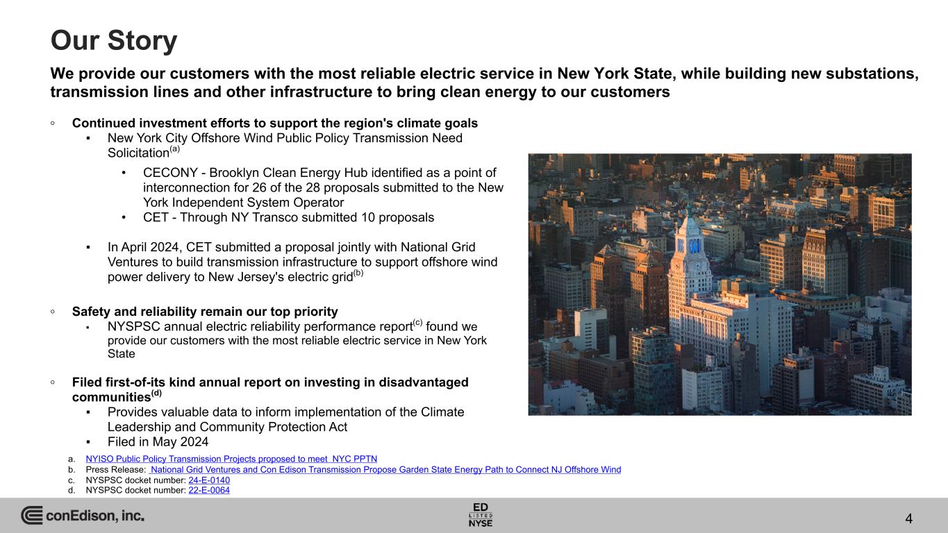 3 Organizational Structure a. As of June 30, 2024. b. Con Edison's issuer ratings and the senior unsecured ratings of CECONY and O&R and outlook shown in order of Moody’s / S&P Global Ratings (S&P) / Fitch. Ratings are not a recommendation to buy, sell or hold securities and may be subject to revision or withdrawal at any time. c. CECONY delivers electricity to approximately 3.7 million customers, gas to approximately 1.1 million customers and steam to approximately 1,520 customers. d. O&R delivers electricity to approximately 0.3 million customers and gas to approximately 0.1 million customers. Regulated Energy Delivery Orange and Rockland Utilities, Inc. (O&R)(d) Ratings(b): Baa2 / A- / A- Outlook(b): Positive / Stable / Stable Consolidated Edison Company of New York, Inc. (CECONY)(c) Ratings(b): A3 / A- / A- Outlook(b): Stable / Stable / Stable FERC Regulated Transmission Market Cap(a): $30.8 billion Ratings(b): Baa1 / A- / BBB+ Outlook(b): Stable / Stable / Stable Con Edison Transmission, Inc. (Con Edison Transmission or CET) Rockland Electric Company (RECO) Percentages of Total Assets by Business 93.7% 5.7% 0.7% CECONY O&R CET 2024 Total Assets: $68 billion(a) 3