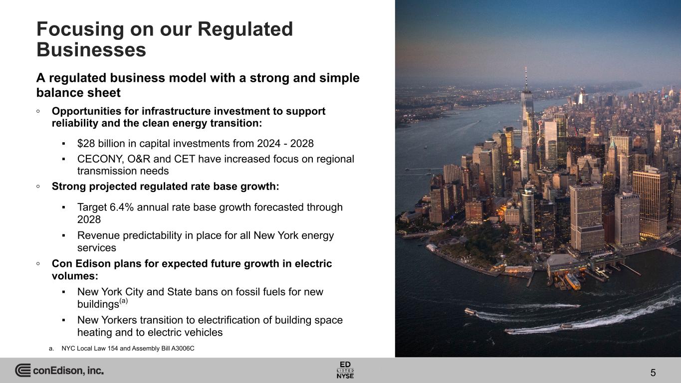 4 Our Story ◦ Continued investment efforts to support the region's climate goals ▪ New York City Offshore Wind Public Policy Transmission Need Solicitation(a) • CECONY - Brooklyn Clean Energy Hub identified as a point of interconnection for 26 of the 28 proposals submitted to the New York Independent System Operator • CET - Through NY Transco submitted 10 proposals ▪ In April 2024, CET submitted a proposal jointly with National Grid Ventures to build transmission infrastructure to support offshore wind power delivery to New Jersey's electric grid(b) ◦ Safety and reliability remain our top priority ▪ NYSPSC annual electric reliability performance report(c) found we provide our customers with the most reliable electric service in New York State ◦ Filed first-of-its kind annual report on investing in disadvantaged communities(d) ▪ Provides valuable data to inform implementation of the Climate Leadership and Community Protection Act ▪ Filed in May 2024 We provide our customers with the most reliable electric service in New York State, while building new substations, transmission lines and other infrastructure to bring clean energy to our customers 4 a. NYISO Public Policy Transmission Projects proposed to meet NYC PPTN b. Press Release: National Grid Ventures and Con Edison Transmission Propose Garden State Energy Path to Connect NJ Offshore Wind c. NYSPSC docket number: 24-E-0140 d. NYSPSC docket number: 22-E-0064