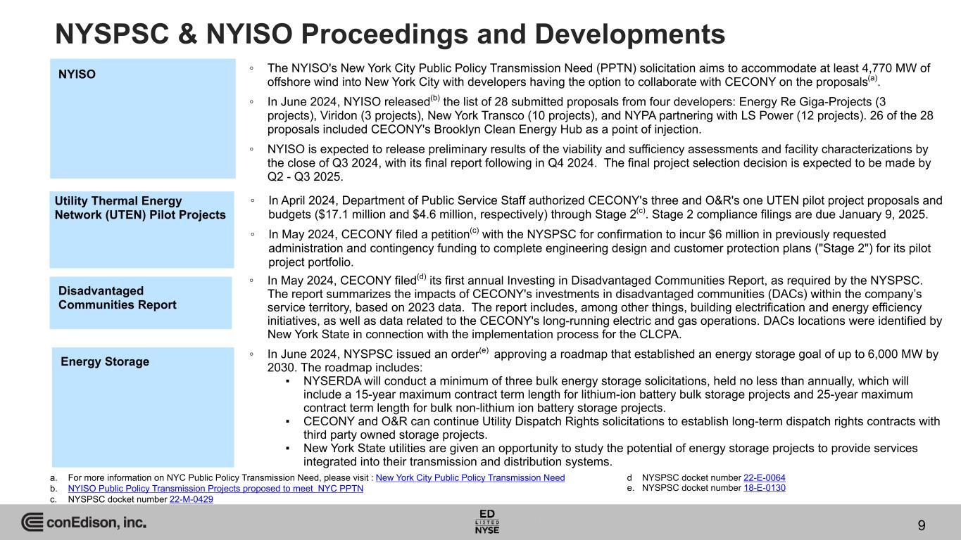 Additional rate plan information: Rate Plan Information | Consolidated Edison, Inc. Typical timeline for rate setting process: Jan 26, 2024 Apr 5, 2024 May 24, 2024 Jun 10, 2024 Jul 2024 Aug 2024 Sep 2024 Oct 2024 Nov 2024 Dec 2024 Jan 2025 Filing with NYSPSC Company Update Staff/Intervenor Testimony Rebuttal Testimony Evidentiary Hearings Final Rate Decision New Rates in EffectInitial Briefs Reply Briefs ALJ Recommended Decision Briefs on Exception Settlement Negotiations Joint Proposal O&R Electric & Gas Rate Case Filing Comparison and Timeline 8 Electric Gas ($ in millions) Case number 24-E-0060 Case number 24-G-0061 Rate Year 1: Jan 2025 - Dec 2025 Jan 2024 Filing Apr 2024 Update May 2024 Staff/ Intervenor Testimony Jan 2024 Filing Apr 2024 Update May 2024 Staff/ Intervenor Testimony New infrastructure investment, including return, depreciation and property taxes $17 $14 $11 $6 $7 $7 ROE/Financing 15 15 7 7 8 4 Depreciation changes due to proposed rates 2 2 (1) 9 10 1 Sales revenue change (9) (9) (15) 4 5 4 Operations & maintenance expenses 8 8 (8) (5) (5) (10) Regulatory amortization (10) (11) (12) (8) (8) (8) Other revenues (7) (7) (7) — — — Income taxes 2 (1) (2) 1 — (1) Total Rate Increase (Decrease) $18 $11 ($27) $14 $17 ($3) Rate Base $1,324 $1,305 $1,286 $695 $711 $707 ROE 10.25% 10.25% 9.50% 10.25% 10.25% 9.50% Equity Ratio 50% 50% 48% 50% 50% 48% Will begin if settlement not reached