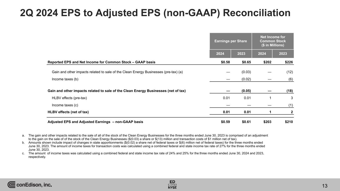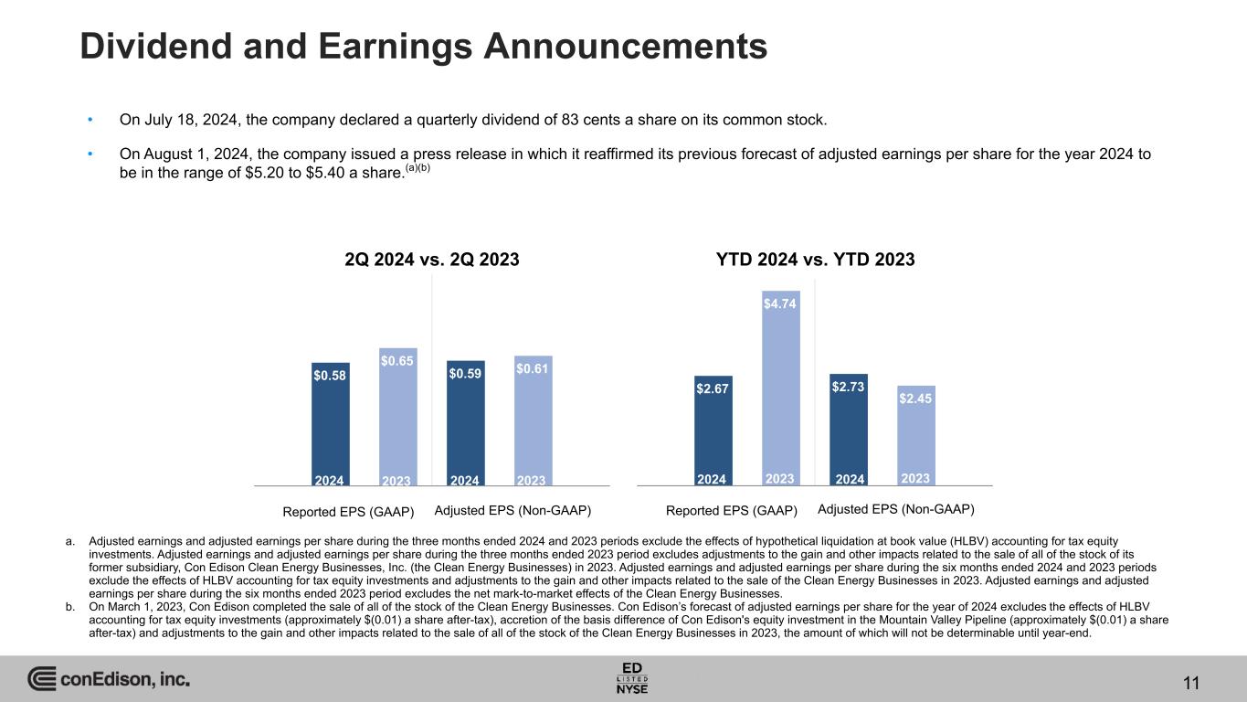 Dividend and Earnings Announcements • On July 18, 2024, the company declared a quarterly dividend of 83 cents a share on its common stock. • On August 1, 2024, the company issued a press release in which it reaffirmed its previous forecast of adjusted earnings per share for the year 2024 to be in the range of $5.20 to $5.40 a share.(a)(b) Reported EPS (GAAP) Adjusted EPS (Non-GAAP) $0.58 $0.65 $0.59 $0.61 2024 2023 2024 2023 2Q 2024 vs. 2Q 2023 a. Adjusted earnings and adjusted earnings per share during the three months ended 2024 and 2023 periods exclude the effects of hypothetical liquidation at book value (HLBV) accounting for tax equity investments. Adjusted earnings and adjusted earnings per share during the three months ended 2023 period excludes adjustments to the gain and other impacts related to the sale of all of the stock of its former subsidiary, Con Edison Clean Energy Businesses, Inc. (the Clean Energy Businesses) in 2023. Adjusted earnings and adjusted earnings per share during the six months ended 2024 and 2023 periods exclude the effects of HLBV accounting for tax equity investments and adjustments to the gain and other impacts related to the sale of the Clean Energy Businesses in 2023. Adjusted earnings and adjusted earnings per share during the six months ended 2023 period excludes the net mark-to-market effects of the Clean Energy Businesses. b. On March 1, 2023, Con Edison completed the sale of all of the stock of the Clean Energy Businesses. Con Edison’s forecast of adjusted earnings per share for the year of 2024 excludes the effects of HLBV accounting for tax equity investments (approximately $(0.01) a share after-tax), accretion of the basis difference of Con Edison's equity investment in the Mountain Valley Pipeline (approximately $(0.01) a share after-tax) and adjustments to the gain and other impacts related to the sale of all of the stock of the Clean Energy Businesses in 2023, the amount of which will not be determinable until year-end. Reported EPS (GAAP) Adjusted EPS (Non-GAAP) $2.67 $4.74 $2.73 $2.45 2024 2023 2024 2023 YTD 2024 vs. YTD 2023 11