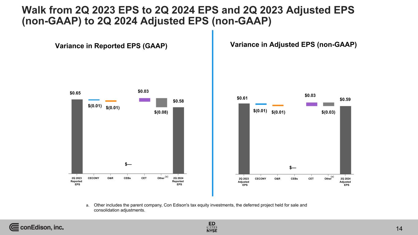 2Q 2024 EPS to Adjusted EPS (non-GAAP) Reconciliation Earnings per Share Net Income for Common Stock ($ in Millions) 2024 2023 2024 2023 Reported EPS and Net Income for Common Stock – GAAP basis $0.58 $0.65 $202 $226 Gain and other impacts related to sale of the Clean Energy Businesses (pre-tax) (a) — (0.03) — (12) Income taxes (b) — (0.02) — (6) Gain and other impacts related to sale of the Clean Energy Businesses (net of tax) — (0.05) — (18) HLBV effects (pre-tax) 0.01 0.01 1 3 Income taxes (c) — — — (1) HLBV effects (net of tax) 0.01 0.01 1 2 Adjusted EPS and Adjusted Earnings – non-GAAP basis $0.59 $0.61 $203 $210 a. The gain and other impacts related to the sale of all of the stock of the Clean Energy Businesses for the three months ended June 30, 2023 is comprised of an adjustment to the gain on the sale of of the stock of the Clean Energy Businesses ($(0.03) a share or $(13) million and transaction costs of $1 million net of tax). b. Amounts shown include impact of changes in state apportionments ($(0.02) a share net of federal taxes or $(6) million net of federal taxes) for the three months ended June 30, 2023. The amount of income taxes for transaction costs was calculated using a combined federal and state income tax rate of 27% for the three months ended June 30, 2023. c. The amount of income taxes was calculated using a combined federal and state income tax rate of 24% and 25% for the three months ended June 30, 2024 and 2023, respectively. 13