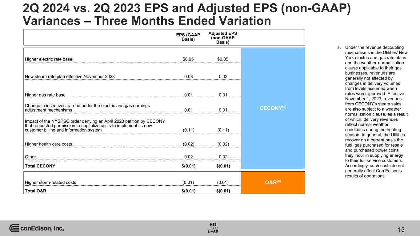Variance in Reported EPS (GAAP) Variance in Adjusted EPS (non-GAAP) 2Q 2023 Reported EPS CECONY O&R CEBs CET Other 2Q 2024 Reported EPS $0.65 $(0.01) $(0.01) $— $0.03 $0.58 2Q 2023 Adjusted EPS CECONY O&R CEBs CET Other 2Q 2024 Adjusted EPS $0.61 $(0.01) $(0.01) $(0.03) $0.59 $— (a) (a) $0.03 $(0.08) a. Other includes the parent company, Con Edison's tax equity investments, the deferred project held for sale and consolidation adjustments. Walk from 2Q 2023 EPS to 2Q 2024 EPS and 2Q 2023 Adjusted EPS (non-GAAP) to 2Q 2024 Adjusted EPS (non-GAAP) 14