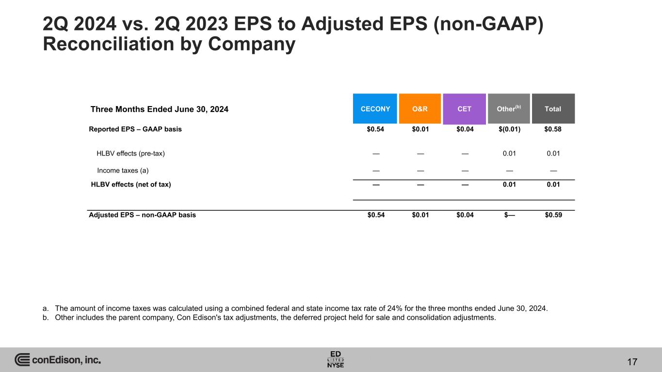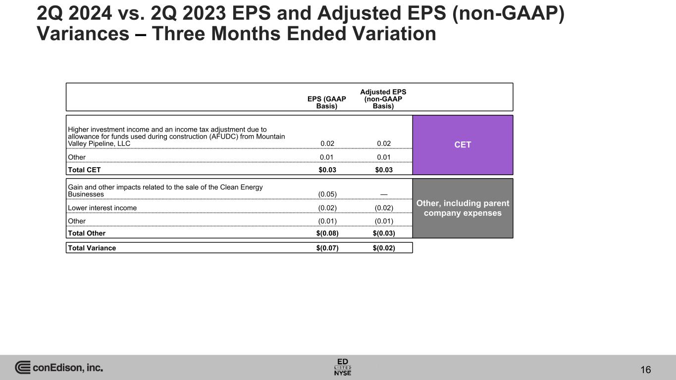 EPS (GAAP Basis) Adjusted EPS (non-GAAP Basis) Higher electric rate base $0.05 $0.05 CECONY(a) New steam rate plan effective November 2023 0.03 0.03 Higher gas rate base 0.01 0.01 Change in incentives earned under the electric and gas earnings adjustment mechanisms 0.01 0.01 Impact of the NYSPSC order denying an April 2023 petition by CECONY that requested permission to capitalize costs to implement its new customer billing and information system (0.11) (0.11) Higher health care costs (0.02) (0.02) Other 0.02 0.02 Total CECONY $(0.01) $(0.01) Higher storm-related costs (0.01) (0.01) O&R(a) Total O&R $(0.01) $(0.01) 2Q 2024 vs. 2Q 2023 EPS and Adjusted EPS (non-GAAP) Variances – Three Months Ended Variation a. Under the revenue decoupling mechanisms in the Utilities’ New York electric and gas rate plans and the weather-normalization clause applicable to their gas businesses, revenues are generally not affected by changes in delivery volumes from levels assumed when rates were approved. Effective November 1, 2023, revenues from CECONY’s steam sales are also subject to a weather normalization clause, as a result of which, delivery revenues reflect normal weather conditions during the heating season. In general, the Utilities recover on a current basis the fuel, gas purchased for resale and purchased power costs they incur in supplying energy to their full-service customers. Accordingly, such costs do not generally affect Con Edison’s results of operations. 15