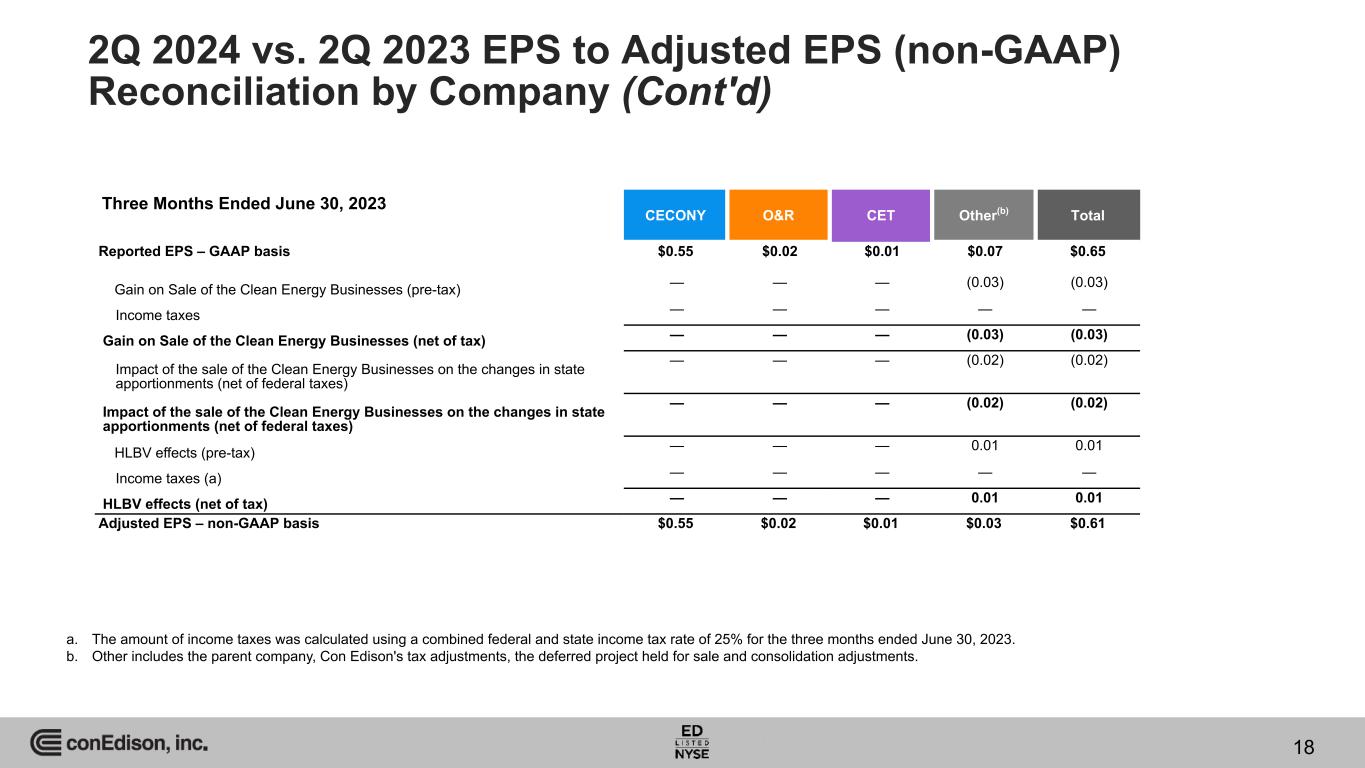 2Q 2024 vs. 2Q 2023 EPS to Adjusted EPS (non-GAAP) Reconciliation by Company CECONY O&R CET Other(b) Total Reported EPS – GAAP basis $0.54 $0.01 $0.04 $(0.01) $0.58 HLBV effects (pre-tax) — — — 0.01 0.01 Income taxes (a) — — — — — HLBV effects (net of tax) — — — 0.01 0.01 Adjusted EPS – non-GAAP basis $0.54 $0.01 $0.04 $— $0.59 Three Months Ended June 30, 2024 a. The amount of income taxes was calculated using a combined federal and state income tax rate of 24% for the three months ended June 30, 2024. b. Other includes the parent company, Con Edison's tax adjustments, the deferred project held for sale and consolidation adjustments. 17