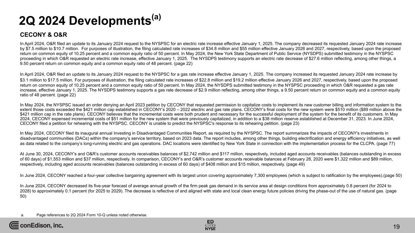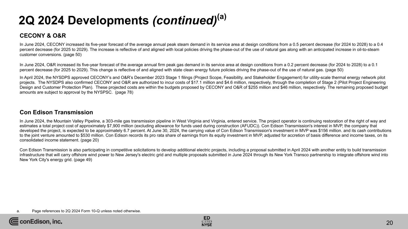 2Q 2024 Developments(a) CECONY & O&R In April 2024, O&R filed an update to its January 2024 request to the NYSPSC for an electric rate increase effective January 1, 2025. The company decreased its requested January 2024 rate increase by $7.5 million to $10.7 million. For purposes of illustration, the filing calculated rate increases of $34.8 million and $55 million effective January 2026 and 2027, respectively, based upon the proposed return on common equity of 10.25 percent and a common equity ratio of 50 percent. In May 2024, the New York State Department of Public Service (NYSDPS) submitted testimony in the NYSPSC proceeding in which O&R requested an electric rate increase, effective January 1, 2025. The NYSDPS testimony supports an electric rate decrease of $27.6 million reflecting, among other things, a 9.50 percent return on common equity and a common equity ratio of 48 percent. (page 22) In April 2024, O&R filed an update to its January 2024 request to the NYSPSC for a gas rate increase effective January 1, 2025. The company increased its requested January 2024 rate increase by $3.1 million to $17.5 million. For purposes of illustration, the filing calculated rate increases of $22.8 million and $19.2 million effective January 2026 and 2027, respectively, based upon the proposed return on common equity of 10.25 percent and a common equity ratio of 50 percent. In May 2024, the NYSDPS submitted testimony in the NYSPSC proceeding in which O&R requested a gas rate increase, effective January 1, 2025. The NYSDPS testimony supports a gas rate decrease of $2.9 million reflecting, among other things, a 9.50 percent return on common equity and a common equity ratio of 48 percent. (page 22) In May 2024, the NYSPSC issued an order denying an April 2023 petition by CECONY that requested permission to capitalize costs to implement its new customer billing and information system to the extent those costs exceeded the $421 million cap established in CECONY’s 2020 – 2022 electric and gas rate plans. CECONY’s final costs for the new system were $510 million ($89 million above the $421 million cap in the rate plans). CECONY believes that the incremental costs were both prudent and necessary for the successful deployment of the system for the benefit of its customers. In May 2024, CECONY expensed incremental costs of $51 million for the new system that were previously capitalized, in addition to a $38 million reserve established at December 31, 2023. In June 2024, CECONY filed a petition for rehearing with the NYSPSC. CECONY is unable to predict the NYSPSC's response to its rehearing petition. (page 23) In May 2024, CECONY filed its inaugural annual Investing in Disadvantaged Communities Report, as required by the NYSPSC. The report summarizes the impacts of CECONY's investments in disadvantaged communities (DACs) within the company’s service territory, based on 2023 data. The report includes, among other things, building electrification and energy efficiency initiatives, as well as data related to the company’s long-running electric and gas operations. DAC locations were identified by New York State in connection with the implementation process for the CLCPA. (page 77) At June 30, 2024, CECONY’s and O&R’s customer accounts receivables balances of $2,742 million and $117 million, respectively, included aged accounts receivables (balances outstanding in excess of 60 days) of $1,553 million and $37 million, respectively. In comparison, CECONY’s and O&R’s customer accounts receivable balances at February 28, 2020 were $1,322 million and $89 million, respectively, including aged accounts receivables (balances outstanding in excess of 60 days) of $408 million and $15 million, respectively. (page 49) In June 2024, CECONY reached a four-year collective bargaining agreement with its largest union covering approximately 7,300 employees (which is subject to ratification by the employees).(page 50) In June 2024, CECONY decreased its five-year forecast of average annual growth of the firm peak gas demand in its service area at design conditions from approximately 0.8 percent (for 2024 to 2028) to approximately 0.1 percent (for 2025 to 2029). The decrease is reflective of and aligned with state and local clean energy future policies driving the phase-out of the use of natural gas. (page 50) a. Page references to 2Q 2024 Form 10-Q unless noted otherwise. 19