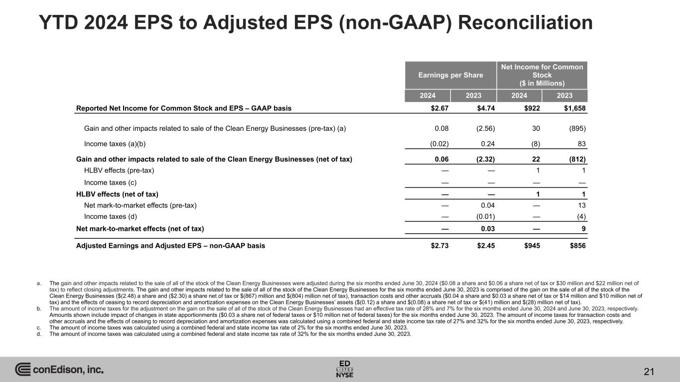 YTD 2024 EPS to Adjusted EPS (non-GAAP) Reconciliation Earnings per Share Net Income for Common Stock ($ in Millions) 2024 2023 2024 2023 Reported Net Income for Common Stock and EPS – GAAP basis $2.67 $4.74 $922 $1,658 Gain and other impacts related to sale of the Clean Energy Businesses (pre-tax) (a) 0.08 (2.56) 30 (895) Income taxes (a)(b) (0.02) 0.24 (8) 83 Gain and other impacts related to sale of the Clean Energy Businesses (net of tax) 0.06 (2.32) 22 (812) HLBV effects (pre-tax) — — 1 1 Income taxes (c) — — — — HLBV effects (net of tax) — — 1 1 Net mark-to-market effects (pre-tax) — 0.04 — 13 Income taxes (d) — (0.01) — (4) Net mark-to-market effects (net of tax) — 0.03 — 9 Adjusted Earnings and Adjusted EPS – non-GAAP basis $2.73 $2.45 $945 $856 a. The gain and other impacts related to the sale of all of the stock of the Clean Energy Businesses were adjusted during the six months ended June 30, 2024 ($0.08 a share and $0.06 a share net of tax or $30 million and $22 million net of tax) to reflect closing adjustments. The gain and other impacts related to the sale of all of the stock of the Clean Energy Businesses for the six months ended June 30, 2023 is comprised of the gain on the sale of all of the stock of the Clean Energy Businesses ($(2.48) a share and ($2.30) a share net of tax or $(867) million and $(804) million net of tax), transaction costs and other accruals ($0.04 a share and $0.03 a share net of tax or $14 million and $10 million net of tax) and the effects of ceasing to record depreciation and amortization expenses on the Clean Energy Businesses’ assets ($(0.12) a share and $(0.08) a share net of tax or $(41) million and $(28) million net of tax). b. The amount of income taxes for the adjustment on the gain on the sale of all of the stock of the Clean Energy Businesses had an effective tax rate of 28% and 7% for the six months ended June 30, 2024 and June 30, 2023, respectively. Amounts shown include impact of changes in state apportionments ($0.03 a share net of federal taxes or $10 million net of federal taxes) for the six months ended June 30, 2023. The amount of income taxes for transaction costs and other accruals and the effects of ceasing to record depreciation and amortization expenses was calculated using a combined federal and state income tax rate of 27% and 32% for the six months ended June 30, 2023, respectively. c. The amount of income taxes was calculated using a combined federal and state income tax rate of 2% for the six months ended June 30, 2023. d. The amount of income taxes was calculated using a combined federal and state income tax rate of 32% for the six months ended June 30, 2023. 21