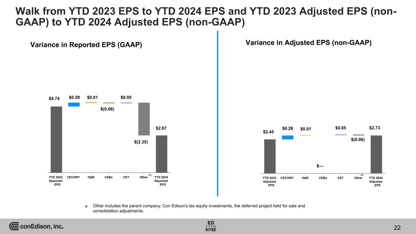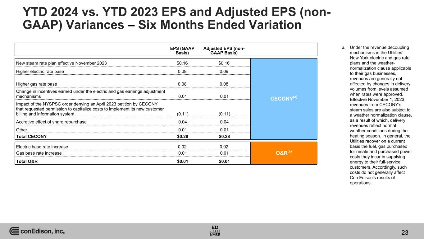 YTD 2023 Adjusted EPS CECONY O&R CEBs CET Other YTD 2024 Adjusted EPS Variance in Reported EPS (GAAP) Variance in Adjusted EPS (non-GAAP) YTD 2023 Reported EPS CECONY O&R CEBs CET Other YTD 2024 Reported EPS $4.74 $0.28 $0.01 $(0.06) $0.05 $(2.35) $2.67 $2.45 $0.28 $0.01 $— $0.05 $(0.06) $2.73 (a) (a) a. Other includes the parent company, Con Edison's tax equity investments, the deferred project held for sale and consolidation adjustments. Walk from YTD 2023 EPS to YTD 2024 EPS and YTD 2023 Adjusted EPS (non- GAAP) to YTD 2024 Adjusted EPS (non-GAAP) 22