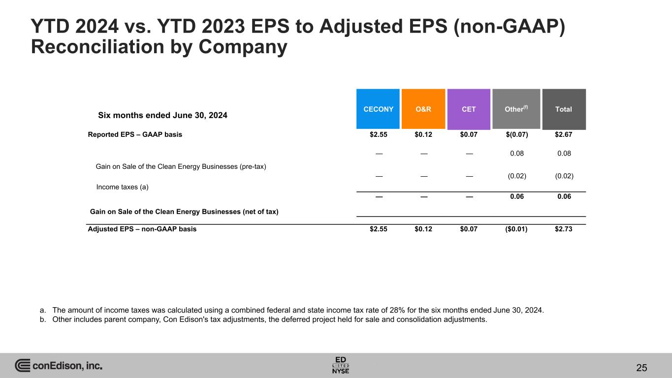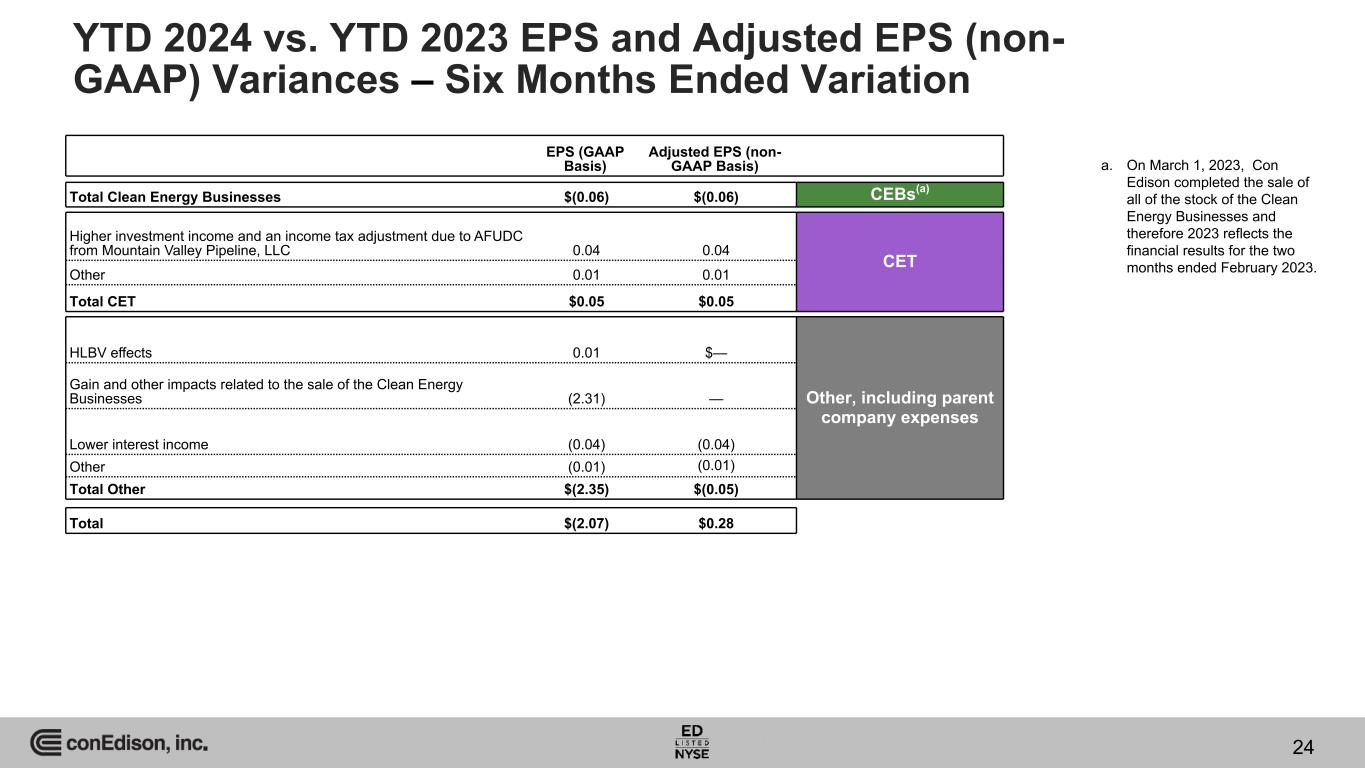 EPS (GAAP Basis) Adjusted EPS (non- GAAP Basis) Total Clean Energy Businesses $(0.06) $(0.06) CEBs(a) Higher investment income and an income tax adjustment due to AFUDC from Mountain Valley Pipeline, LLC 0.04 0.04 CET Other 0.01 0.01 Total CET $0.05 $0.05 HLBV effects 0.01 $— Other, including parent company expenses Gain and other impacts related to the sale of the Clean Energy Businesses (2.31) — Lower interest income (0.04) (0.04) Other (0.01) (0.01) Total Other $(2.35) $(0.05) Total $(2.07) $0.28 a. On March 1, 2023, Con Edison completed the sale of all of the stock of the Clean Energy Businesses and therefore 2023 reflects the financial results for the two months ended February 2023. YTD 2024 vs. YTD 2023 EPS and Adjusted EPS (non- GAAP) Variances – Six Months Ended Variation 24