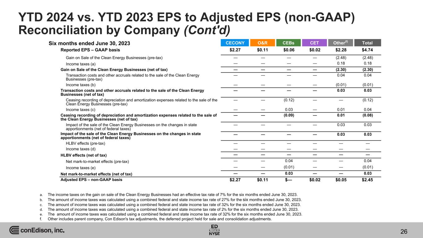 YTD 2024 vs. YTD 2023 EPS to Adjusted EPS (non-GAAP) Reconciliation by Company CECONY O&R CET Other(f) Total Reported EPS – GAAP basis $2.55 $0.12 $0.07 $(0.07) $2.67 Gain on Sale of the Clean Energy Businesses (pre-tax) — — — 0.08 0.08 Income taxes (a) — — — (0.02) (0.02) Gain on Sale of the Clean Energy Businesses (net of tax) — — — 0.06 0.06 Adjusted EPS – non-GAAP basis $2.55 $0.12 $0.07 ($0.01) $2.73 Six months ended June 30, 2024 a. The amount of income taxes was calculated using a combined federal and state income tax rate of 28% for the six months ended June 30, 2024. b. Other includes parent company, Con Edison's tax adjustments, the deferred project held for sale and consolidation adjustments. 25