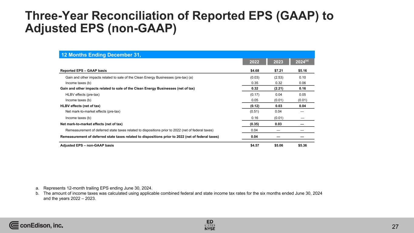 YTD 2024 vs. YTD 2023 EPS to Adjusted EPS (non-GAAP) Reconciliation by Company (Cont'd) CECONY O&R CEBs CET Other(f) Total Reported EPS – GAAP basis $2.27 $0.11 $0.06 $0.02 $2.28 $4.74 Gain on Sale of the Clean Energy Businesses (pre-tax) — — — — (2.48) (2.48) Income taxes (a) — — — — 0.18 0.18 Gain on Sale of the Clean Energy Businesses (net of tax) — — — — (2.30) (2.30) Transaction costs and other accruals related to the sale of the Clean Energy Businesses (pre-tax) — — — — 0.04 0.04 Income taxes (b) — — — — (0.01) (0.01) Transaction costs and other accruals related to the sale of the Clean Energy Businesses (net of tax) — — — — 0.03 0.03 Ceasing recording of depreciation and amortization expenses related to the sale of the Clean Energy Businesses (pre-tax) — — (0.12) — — (0.12) Income taxes (c) — — 0.03 — 0.01 0.04 Ceasing recording of depreciation and amortization expenses related to the sale of the Clean Energy Businesses (net of tax) — — (0.09) — 0.01 (0.08) Impact of the sale of the Clean Energy Businesses on the changes in state apportionments (net of federal taxes) — — — — 0.03 0.03 Impact of the sale of the Clean Energy Businesses on the changes in state apportionments (net of federal taxes) — — — — 0.03 0.03 HLBV effects (pre-tax) — — — — — — Income taxes (d) — — — — — — HLBV effects (net of tax) — — — — — — Net mark-to-market effects (pre-tax) — — 0.04 — — 0.04 Income taxes (e) — — (0.01) — — (0.01) Net mark-to-market effects (net of tax) — — 0.03 — — 0.03 Adjusted EPS – non-GAAP basis $2.27 $0.11 $— $0.02 $0.05 $2.45 Six months ended June 30, 2023 a. The income taxes on the gain on sale of the Clean Energy Businesses had an effective tax rate of 7% for the six months ended June 30, 2023. b. The amount of income taxes was calculated using a combined federal and state income tax rate of 27% for the six months ended June 30, 2023. c. The amount of income taxes was calculated using a combined federal and state income tax rate of 32% for the six months ended June 30, 2023. d. The amount of income taxes was calculated using a combined federal and state income tax rate of 2% for the six months ended June 30, 2023. e. The amount of income taxes was calculated using a combined federal and state income tax rate of 32% for the six months ended June 30, 2023. f. Other includes parent company, Con Edison's tax adjustments, the deferred project held for sale and consolidation adjustments. 26