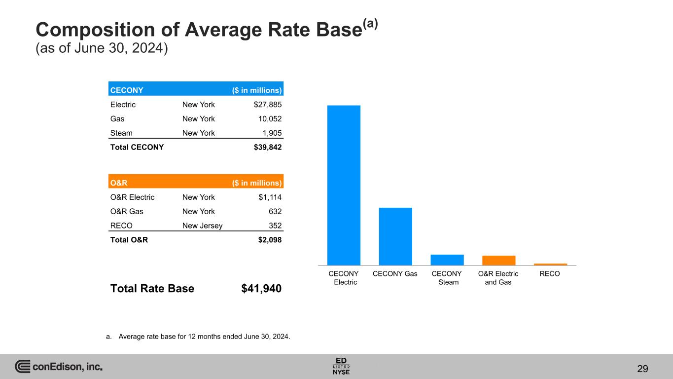 Composition of Average Rate Base(a) (as of June 30, 2024) a. Average rate base for 12 months ended June 30, 2024. CECONY ($ in millions) Electric New York $27,885 Gas New York 10,052 Steam New York 1,905 Total CECONY $39,842 O&R ($ in millions) O&R Electric New York $1,114 O&R Gas New York 632 RECO New Jersey 352 Total O&R $2,098 Total Rate Base $41,940 CECONY Electric CECONY Gas CECONY Steam O&R Electric and Gas RECO 29