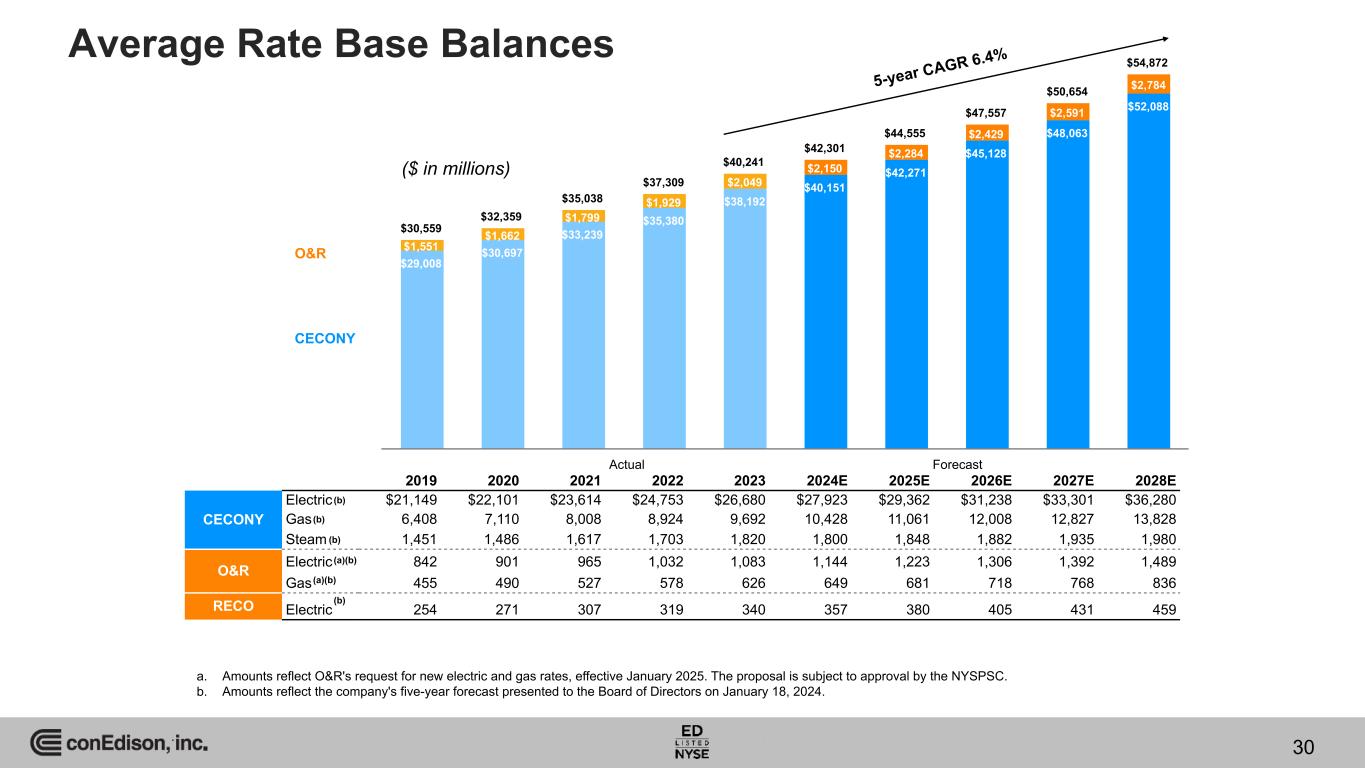 $30,559 $32,359 $35,038 $37,309 $40,241 $42,301 $44,555 $47,557 $50,654 $54,872 $29,008 $30,697 $33,239 $35,380 $38,192 $40,151 $42,271 $45,128 $48,063 $52,088 $1,551 $1,662 $1,799 $1,929 $2,049 $2,150 $2,284 $2,429 $2,591 $2,784 Average Rate Base Balances O&R CECONY 5-year CAGR 6.4% 2019 2020 2021 2022 2023 2024E 2025E 2026E 2027E 2028E CECONY Electric $21,149 $22,101 $23,614 $24,753 $26,680 $27,923 $29,362 $31,238 $33,301 $36,280 Gas 6,408 7,110 8,008 8,924 9,692 10,428 11,061 12,008 12,827 13,828 Steam 1,451 1,486 1,617 1,703 1,820 1,800 1,848 1,882 1,935 1,980 O&R Electric 842 901 965 1,032 1,083 1,144 1,223 1,306 1,392 1,489 Gas 455 490 527 578 626 649 681 718 768 836 RECO Electric 254 271 307 319 340 357 380 405 431 459 ForecastActual a. Amounts reflect O&R's request for new electric and gas rates, effective January 2025. The proposal is subject to approval by the NYSPSC. b. Amounts reflect the company's five-year forecast presented to the Board of Directors on January 18, 2024. . (a)(b) (a)(b) (b) (b) (b) (b) ($ in millions) 30