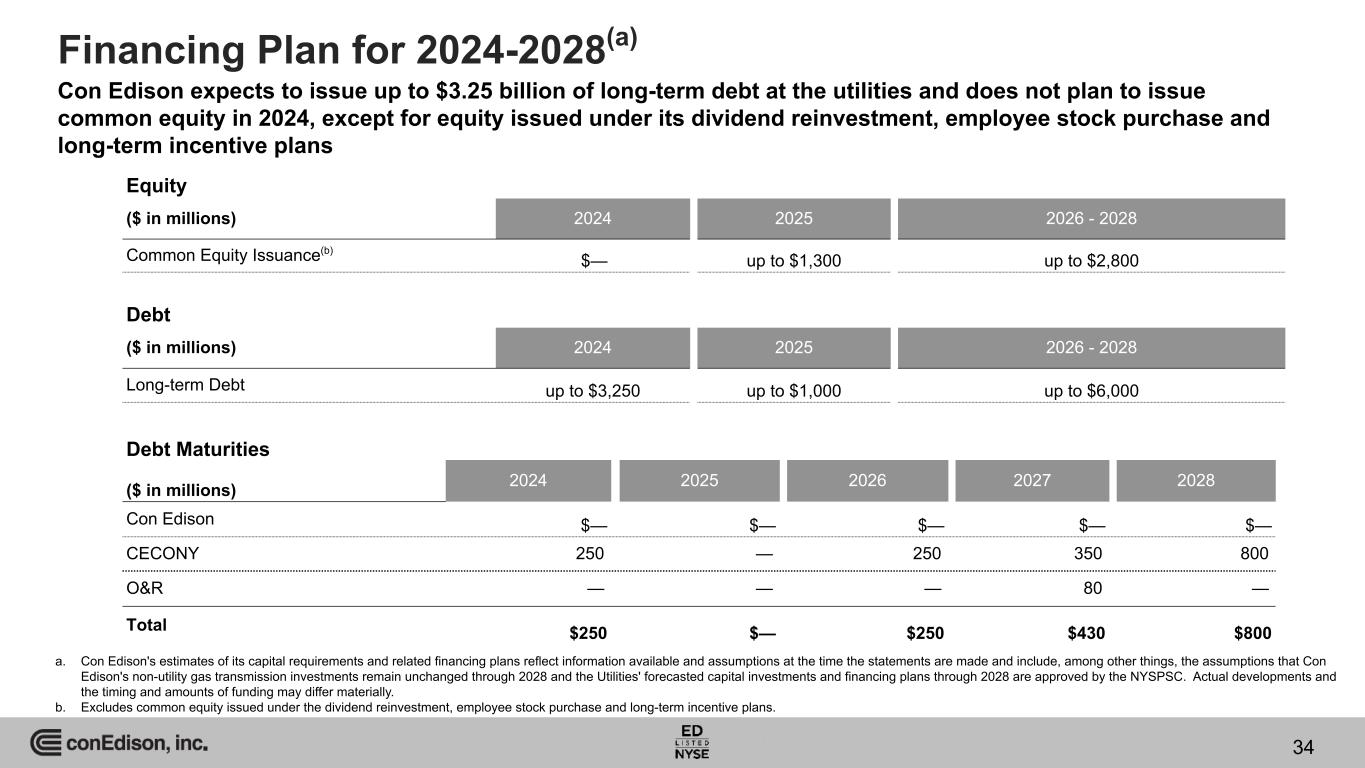 $3,223 $3,466 $3,635 $4,001 $4,379 $4,822 $5,212 $5,879 $5,874 $5,867 2019 2020 2021 2022 2023 2024E 2025E 2026E 2027E 2028E Utilities' Capital Investments Gas Electric Annual CECONY Capital Investments Annual O&R Capital Investments Electric Gas Steam Depreciation Electric Gas Depreciation 2019 1,851 1,078 91 1,373 142 61 84 2020 2,080 1,044 122 1,598 159 61 90 2021 2,189 1,126 103 1,705 147 70 95 2022 2,522 1,128 108 1,778 167 76 98 2023 2,909 1,046 128 1,942 211 85 105 2024E 3,277 1,152 104 2,126 209 80 119 2025E 3,554 1,116 107 2,267 350 85 123 2026E 4,171 1,126 110 2,414 380 92 127 2027E 4,128 1,156 138 2,557 367 85 138 2028E 4,115 1,177 142 2,705 353 80 148 Steam Depreciation Actual Forecast a. Amounts reflect the company's five-year forecast as of January 2024. b. Amounts reflect O&R's request for new electric and gas rates, effective January 2025. The proposal is subject to approval by the NYSPSC. c. 2023 Form 10-K, page 28. (a)(b) ($ in millions) 33