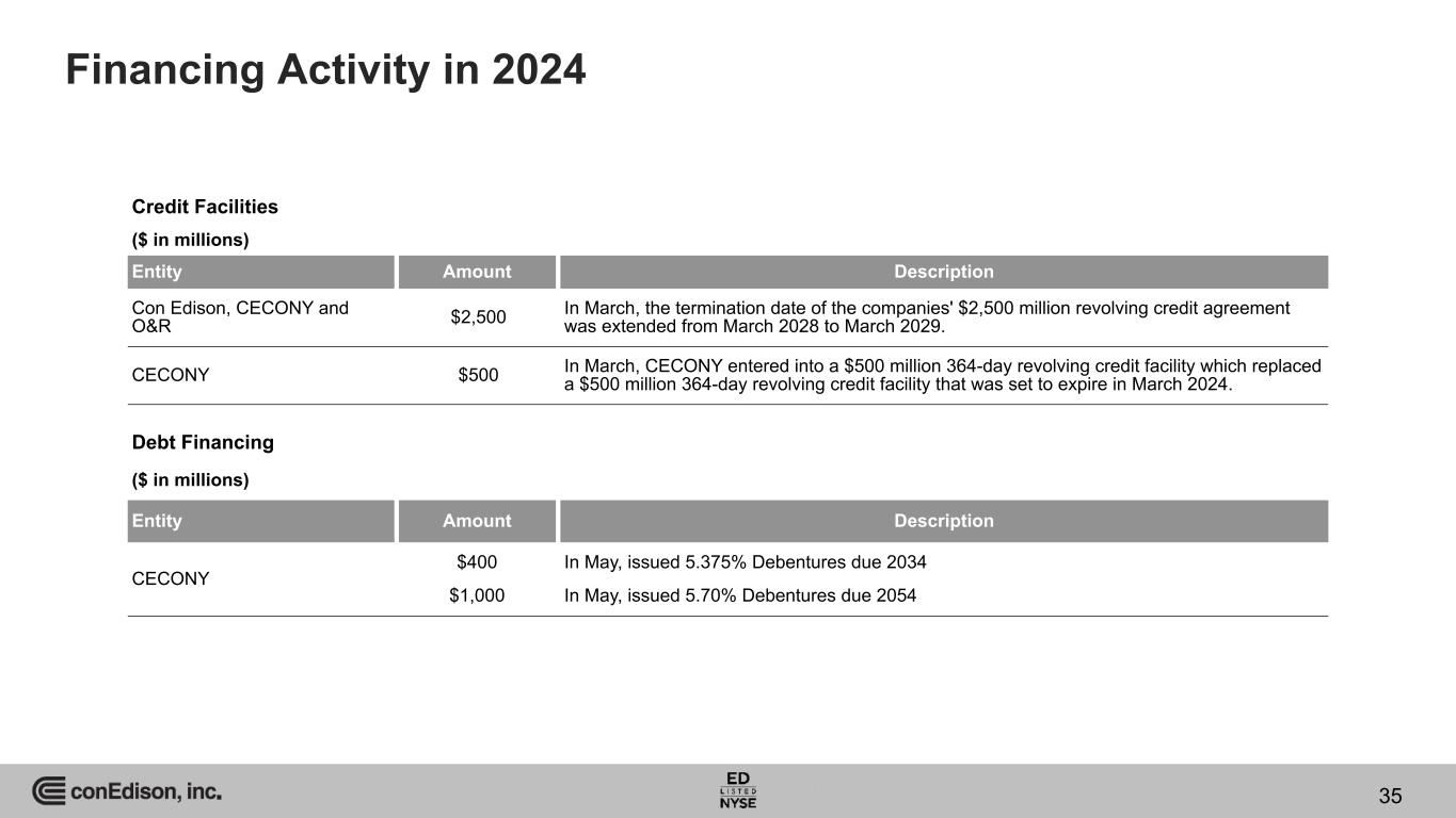 Financing Activity in 2024 Credit Facilities ($ in millions) Entity Amount Description Con Edison, CECONY and O&R $2,500 In March, the termination date of the companies' $2,500 million revolving credit agreement was extended from March 2028 to March 2029. CECONY $500 In March, CECONY entered into a $500 million 364-day revolving credit facility which replaced a $500 million 364-day revolving credit facility that was set to expire in March 2024. 35 Debt Financing ($ in millions) Entity Amount Description CECONY $400 $1,000 In May, issued 5.375% Debentures due 2034 In May, issued 5.70% Debentures due 2054