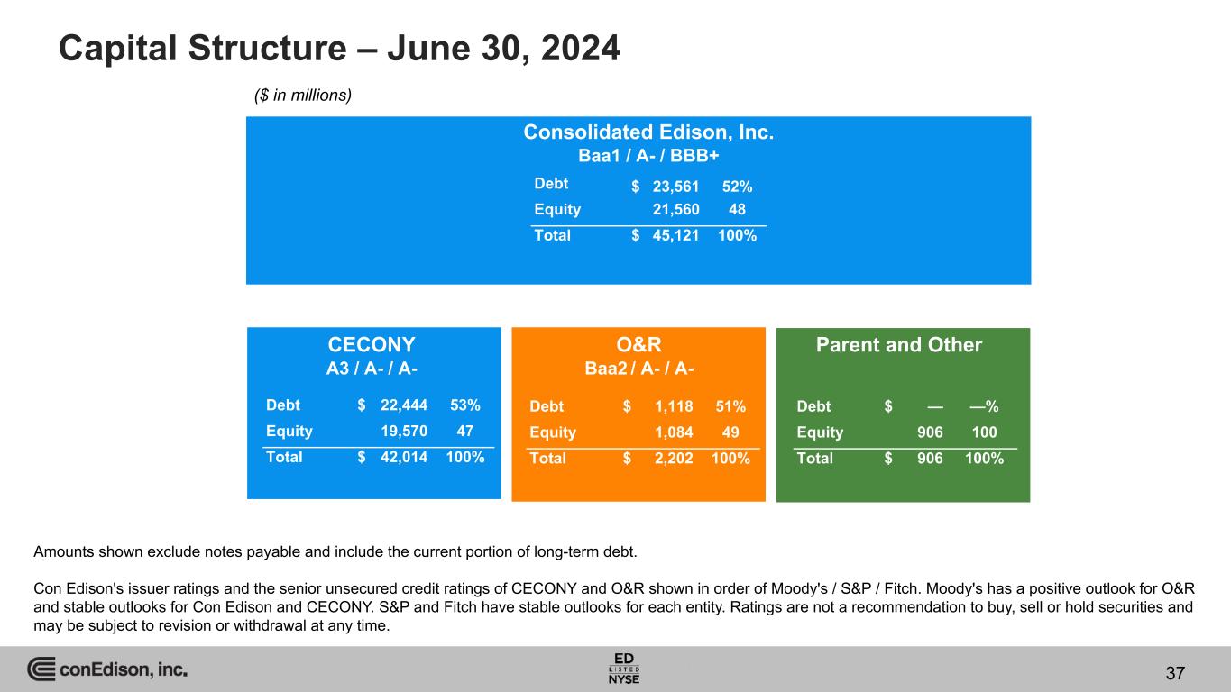 Capital Structure – June 30, 2024 Consolidated Edison, Inc. Baa1 / A- / BBB+ CECONY A3 / A- / A- O&R Baa2 / A- / A- Parent and Other Debt $ 23,561 52% Equity 21,560 48 Total $ 45,121 100% Debt $ 22,444 53% Equity 19,570 47 Total $ 42,014 100% Debt $ 1,118 51% Equity 1,084 49 Total $ 2,202 100% Debt $ — —% Equity 906 100 Total $ 906 100% Amounts shown exclude notes payable and include the current portion of long-term debt. Con Edison's issuer ratings and the senior unsecured credit ratings of CECONY and O&R shown in order of Moody's / S&P / Fitch. Moody's has a positive outlook for O&R and stable outlooks for Con Edison and CECONY. S&P and Fitch have stable outlooks for each entity. Ratings are not a recommendation to buy, sell or hold securities and may be subject to revision or withdrawal at any time. ($ in millions) 37