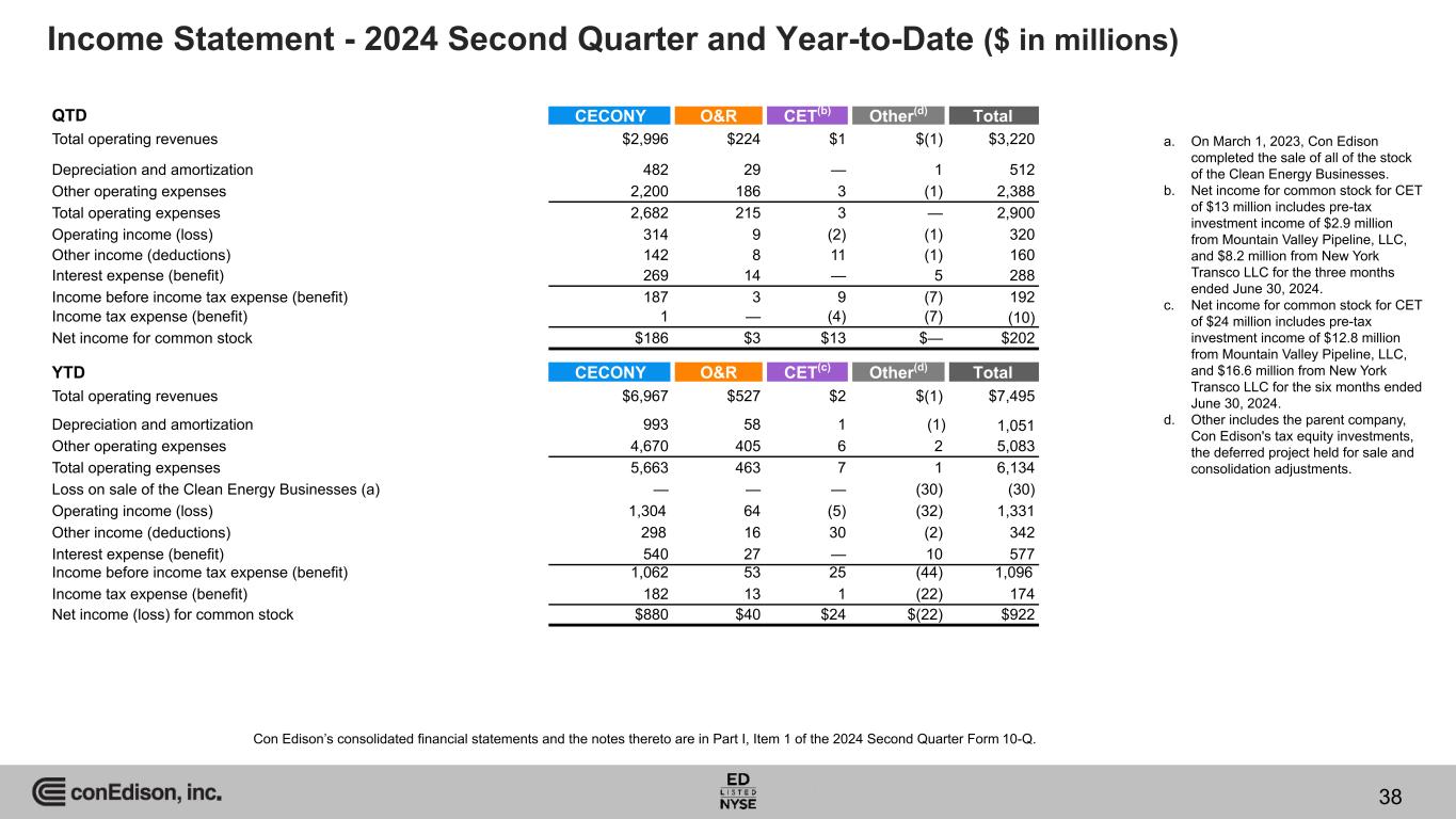 Income Statement - 2024 Second Quarter and Year-to-Date ($ in millions) QTD CECONY O&R CET(b) Other(d) Total Total operating revenues $2,996 $224 $1 $(1) $3,220 Depreciation and amortization 482 29 — 1 512 Other operating expenses 2,200 186 3 (1) 2,388 Total operating expenses 2,682 215 3 — 2,900 Operating income (loss) 314 9 (2) (1) 320 Other income (deductions) 142 8 11 (1) 160 Interest expense (benefit) 269 14 — 5 288 Income before income tax expense (benefit) 187 3 9 (7) 192 Income tax expense (benefit) 1 — (4) (7) (10) Net income for common stock $186 $3 $13 $— $202 YTD CECONY O&R CET(c) Other(d) Total Total operating revenues $6,967 $527 $2 $(1) $7,495 Depreciation and amortization 993 58 1 (1) 1,051 Other operating expenses 4,670 405 6 2 5,083 Total operating expenses 5,663 463 7 1 6,134 Loss on sale of the Clean Energy Businesses (a) — — — (30) (30) Operating income (loss) 1,304 64 (5) (32) 1,331 Other income (deductions) 298 16 30 (2) 342 Interest expense (benefit) 540 27 — 10 577 Income before income tax expense (benefit) 1,062 53 25 (44) 1,096 Income tax expense (benefit) 182 13 1 (22) 174 Net income (loss) for common stock $880 $40 $24 $(22) $922 a. On March 1, 2023, Con Edison completed the sale of all of the stock of the Clean Energy Businesses. b. Net income for common stock for CET of $13 million includes pre-tax investment income of $2.9 million from Mountain Valley Pipeline, LLC, and $8.2 million from New York Transco LLC for the three months ended June 30, 2024. c. Net income for common stock for CET of $24 million includes pre-tax investment income of $12.8 million from Mountain Valley Pipeline, LLC, and $16.6 million from New York Transco LLC for the six months ended June 30, 2024. d. Other includes the parent company, Con Edison's tax equity investments, the deferred project held for sale and consolidation adjustments. Con Edison’s consolidated financial statements and the notes thereto are in Part I, Item 1 of the 2024 Second Quarter Form 10-Q. 38