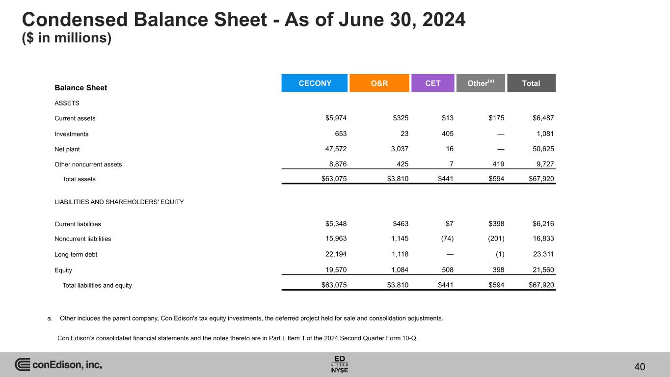 Condensed Balance Sheet - As of June 30, 2024 ($ in millions) Balance Sheet CECONY O&R CET Other(a) Total ASSETS Current assets $5,974 $325 $13 $175 $6,487 Investments 653 23 405 — 1,081 Net plant 47,572 3,037 16 — 50,625 Other noncurrent assets 8,876 425 7 419 9,727 Total assets $63,075 $3,810 $441 $594 $67,920 LIABILITIES AND SHAREHOLDERS' EQUITY Current liabilities $5,348 $463 $7 $398 $6,216 Noncurrent liabilities 15,963 1,145 (74) (201) 16,833 Long-term debt 22,194 1,118 — (1) 23,311 Equity 19,570 1,084 508 398 21,560 Total liabilities and equity $63,075 $3,810 $441 $594 $67,920 a. Other includes the parent company, Con Edison's tax equity investments, the deferred project held for sale and consolidation adjustments. Con Edison’s consolidated financial statements and the notes thereto are in Part I, Item 1 of the 2024 Second Quarter Form 10-Q. 40