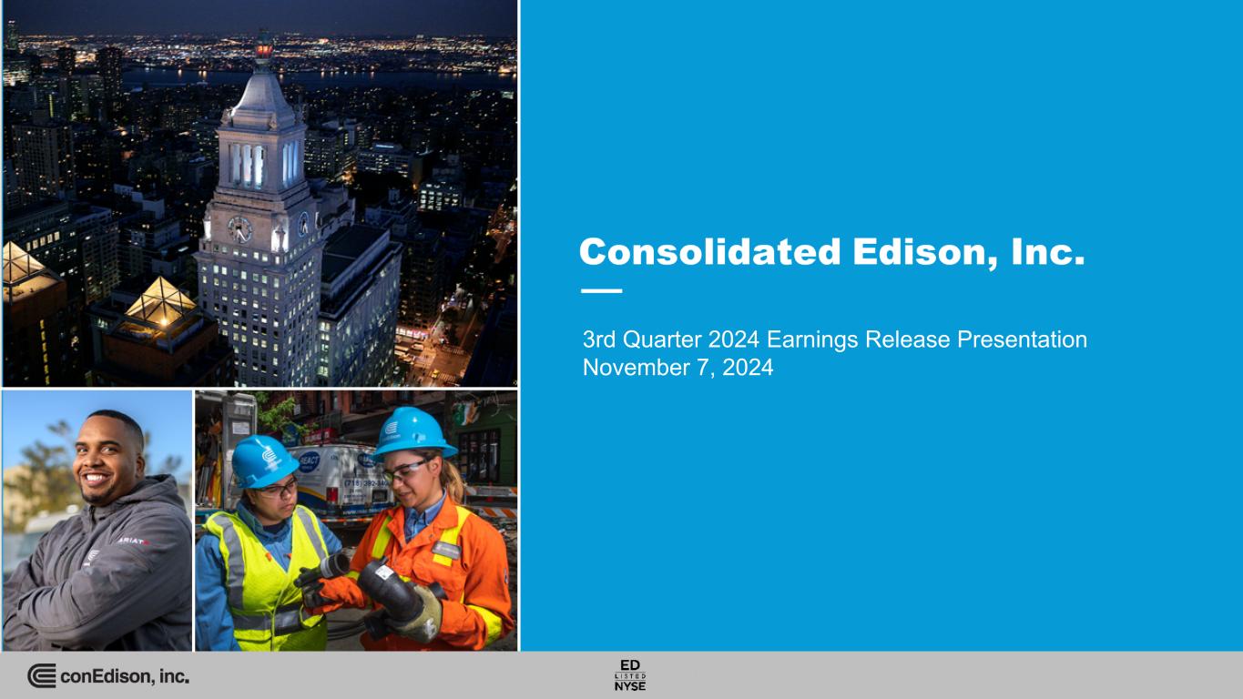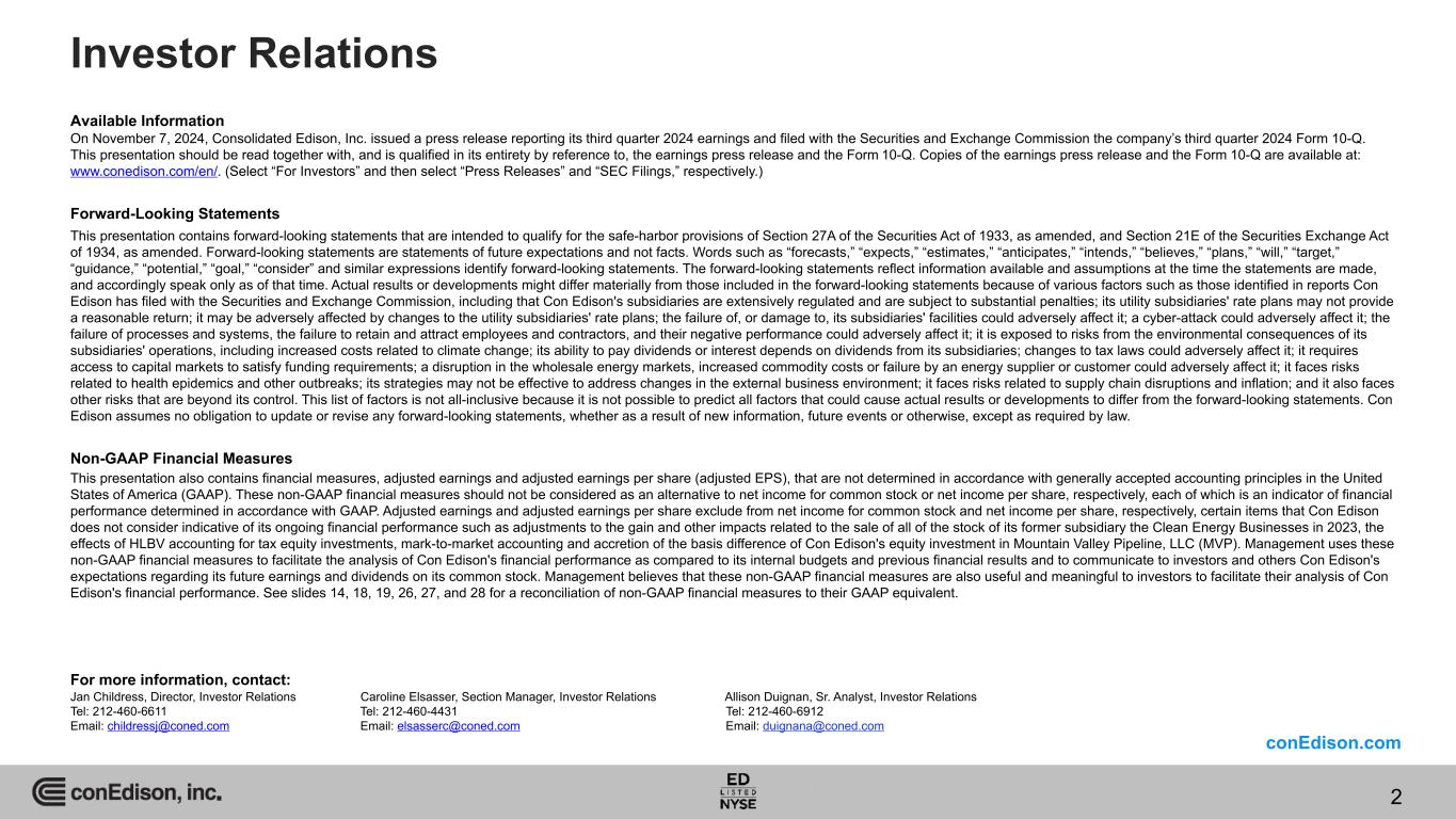 Available Information On November 7, 2024, Consolidated Edison, Inc. issued a press release reporting its third quarter 2024 earnings and filed with the Securities and Exchange Commission the company’s third quarter 2024 Form 10-Q. This presentation should be read together with, and is qualified in its entirety by reference to, the earnings press release and the Form 10-Q. Copies of the earnings press release and the Form 10-Q are available at: www.conedison.com/en/. (Select “For Investors” and then select “Press Releases” and “SEC Filings,” respectively.) Forward-Looking Statements This presentation contains forward-looking statements that are intended to qualify for the safe-harbor provisions of Section 27A of the Securities Act of 1933, as amended, and Section 21E of the Securities Exchange Act of 1934, as amended. Forward-looking statements are statements of future expectations and not facts. Words such as “forecasts,” “expects,” “estimates,” “anticipates,” “intends,” “believes,” “plans,” “will,” “target,” “guidance,” “potential,” “goal,” “consider” and similar expressions identify forward-looking statements. The forward-looking statements reflect information available and assumptions at the time the statements are made, and accordingly speak only as of that time. Actual results or developments might differ materially from those included in the forward-looking statements because of various factors such as those identified in reports Con Edison has filed with the Securities and Exchange Commission, including that Con Edison's subsidiaries are extensively regulated and are subject to substantial penalties; its utility subsidiaries' rate plans may not provide a reasonable return; it may be adversely affected by changes to the utility subsidiaries' rate plans; the failure of, or damage to, its subsidiaries' facilities could adversely affect it; a cyber-attack could adversely affect it; the failure of processes and systems, the failure to retain and attract employees and contractors, and their negative performance could adversely affect it; it is exposed to risks from the environmental consequences of its subsidiaries' operations, including increased costs related to climate change; its ability to pay dividends or interest depends on dividends from its subsidiaries; changes to tax laws could adversely affect it; it requires access to capital markets to satisfy funding requirements; a disruption in the wholesale energy markets, increased commodity costs or failure by an energy supplier or customer could adversely affect it; it faces risks related to health epidemics and other outbreaks; its strategies may not be effective to address changes in the external business environment; it faces risks related to supply chain disruptions and inflation; and it also faces other risks that are beyond its control. This list of factors is not all-inclusive because it is not possible to predict all factors that could cause actual results or developments to differ from the forward-looking statements. Con Edison assumes no obligation to update or revise any forward-looking statements, whether as a result of new information, future events or otherwise, except as required by law. Non-GAAP Financial Measures This presentation also contains financial measures, adjusted earnings and adjusted earnings per share (adjusted EPS), that are not determined in accordance with generally accepted accounting principles in the United States of America (GAAP). These non-GAAP financial measures should not be considered as an alternative to net income for common stock or net income per share, respectively, each of which is an indicator of financial performance determined in accordance with GAAP. Adjusted earnings and adjusted earnings per share exclude from net income for common stock and net income per share, respectively, certain items that Con Edison does not consider indicative of its ongoing financial performance such as adjustments to the gain and other impacts related to the sale of all of the stock of its former subsidiary the Clean Energy Businesses in 2023, the effects of HLBV accounting for tax equity investments, mark-to-market accounting and accretion of the basis difference of Con Edison's equity investment in Mountain Valley Pipeline, LLC (MVP). Management uses these non-GAAP financial measures to facilitate the analysis of Con Edison's financial performance as compared to its internal budgets and previous financial results and to communicate to investors and others Con Edison's expectations regarding its future earnings and dividends on its common stock. Management believes that these non-GAAP financial measures are also useful and meaningful to investors to facilitate their analysis of Con Edison's financial performance. See slides 14, 18, 19, 26, 27, and 28 for a reconciliation of non-GAAP financial measures to their GAAP equivalent. For more information, contact: Jan Childress, Director, Investor Relations Caroline Elsasser, Section Manager, Investor Relations Allison Duignan, Sr. Analyst, Investor Relations Tel: 212-460-6611 Tel: 212-460-4431 Tel: 212-460-6912 Email: childressj@coned.com Email: elsasserc@coned.com Email: duignana@coned.com Investor Relations conEdison.com 2