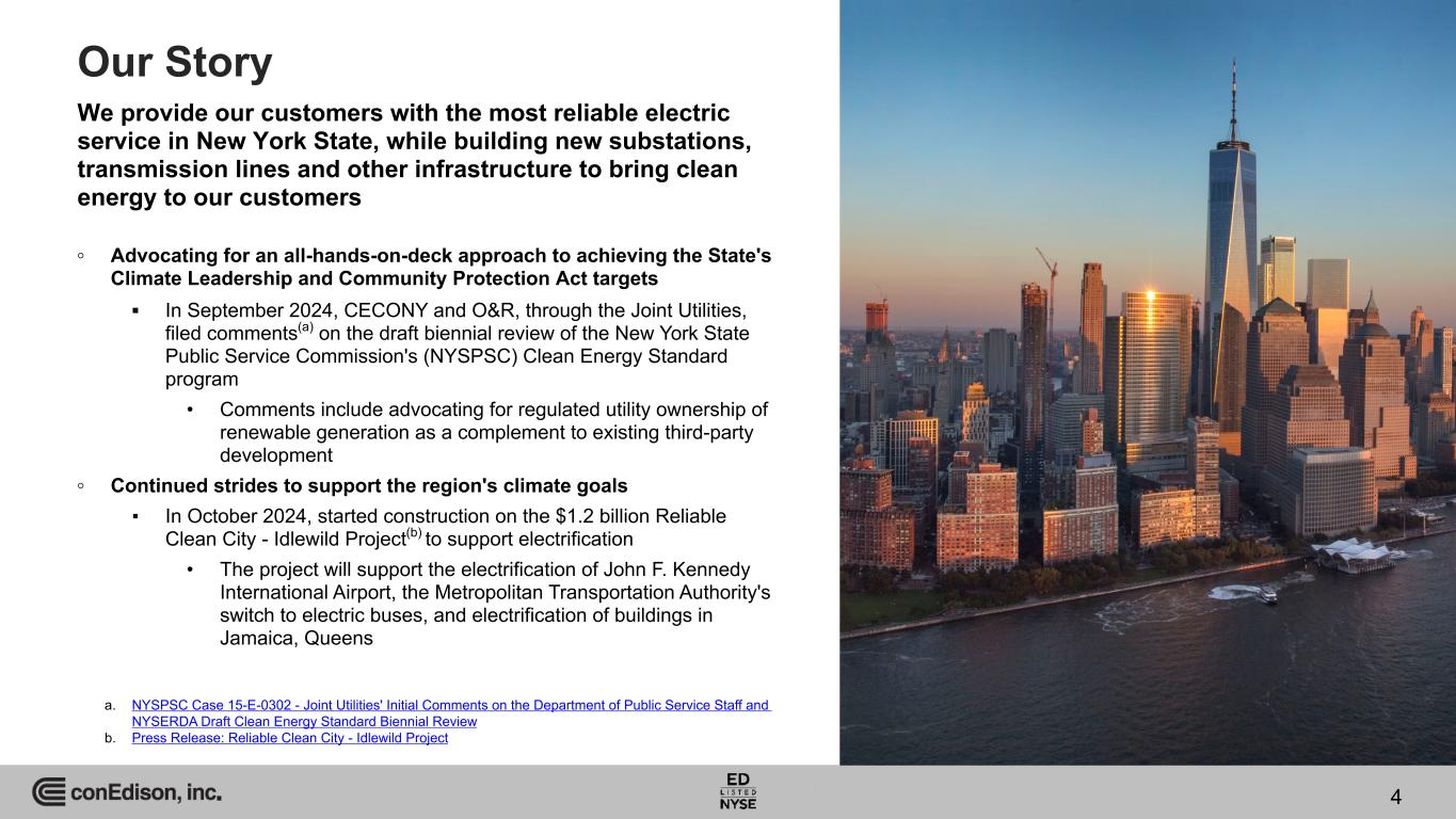 3 Organizational Structure a. As of September 30, 2024. b. Con Edison's issuer ratings and the senior unsecured ratings of CECONY and O&R and outlook shown in order of Moody’s / S&P Global Ratings (S&P) / Fitch. Ratings are not a recommendation to buy, sell or hold securities and may be subject to revision or withdrawal at any time. c. CECONY delivers electricity to approximately 3.7 million customers, gas to approximately 1.1 million customers and steam to approximately 1,510 customers. d. O&R delivers electricity to approximately 0.3 million customers and gas to over 0.1 million customers. Regulated Energy Delivery Orange and Rockland Utilities, Inc. (O&R)(d) Ratings(b): Baa2 / A- / A- Outlook(b): Positive / Stable / Stable Consolidated Edison Company of New York, Inc. (CECONY)(c) Ratings(b): A3 / A- / A- Outlook(b): Stable / Stable / Stable FERC Regulated Transmission Market Cap(a): $36.0 billion Ratings(b): Baa1 / A- / BBB+ Outlook(b): Stable / Stable / Stable Con Edison Transmission, Inc. (Con Edison Transmission or CET) Rockland Electric Company (RECO) Percentages of Total Assets by Business 93.5% 5.8% 0.7% CECONY O&R CET 2024 Total Assets: $69 billion(a) 3