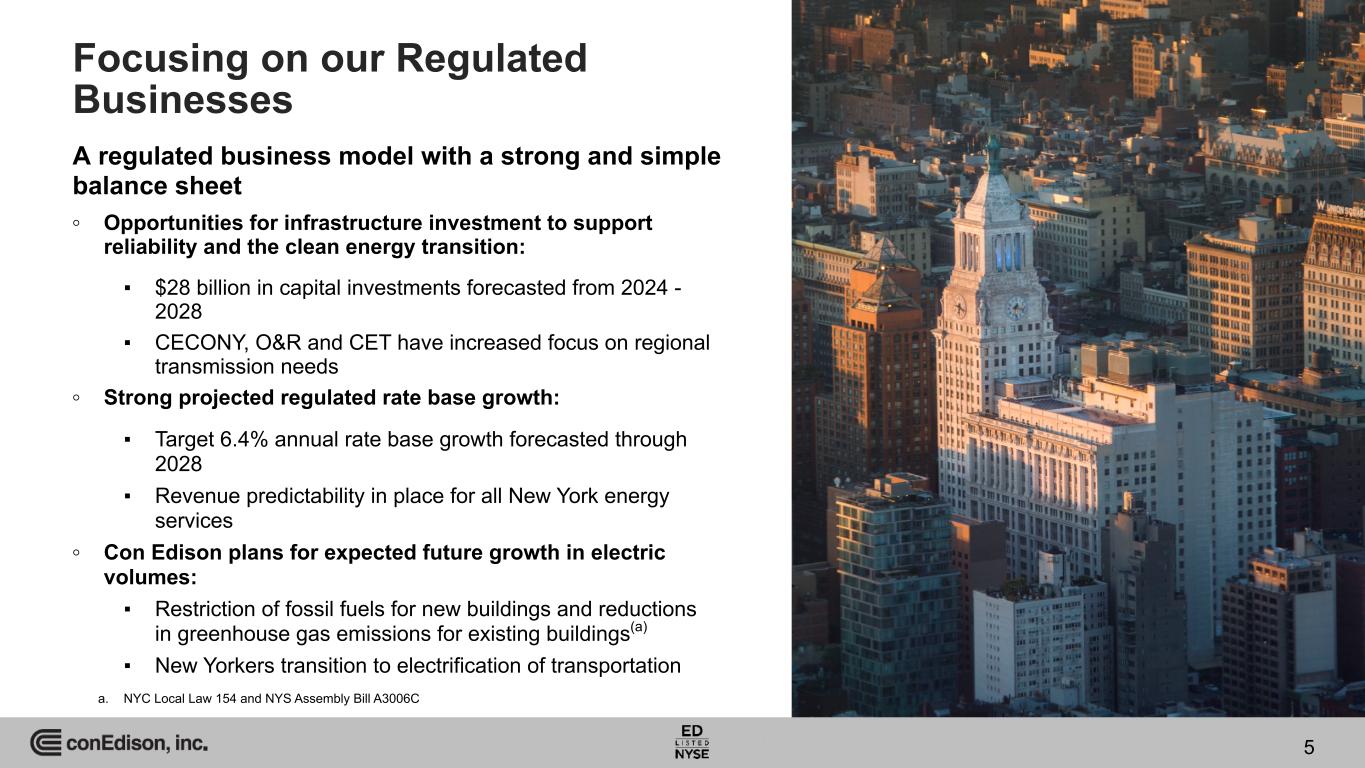 4 Our Story ◦ Advocating for an all-hands-on-deck approach to achieving the State's Climate Leadership and Community Protection Act targets ▪ In September 2024, CECONY and O&R, through the Joint Utilities, filed comments(a) on the draft biennial review of the New York State Public Service Commission's (NYSPSC) Clean Energy Standard program • Comments include advocating for regulated utility ownership of renewable generation as a complement to existing third-party development ◦ Continued strides to support the region's climate goals ▪ In October 2024, started construction on the $1.2 billion Reliable Clean City - Idlewild Project(b) to support electrification • The project will support the electrification of John F. Kennedy International Airport, the Metropolitan Transportation Authority's switch to electric buses, and electrification of buildings in Jamaica, Queens We provide our customers with the most reliable electric service in New York State, while building new substations, transmission lines and other infrastructure to bring clean energy to our customers 4 a. NYSPSC Case 15-E-0302 - Joint Utilities' Initial Comments on the Department of Public Service Staff and NYSERDA Draft Clean Energy Standard Biennial Review b. Press Release: Reliable Clean City - Idlewild Project