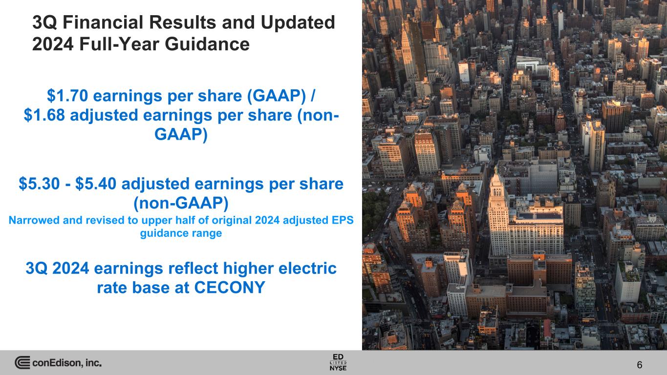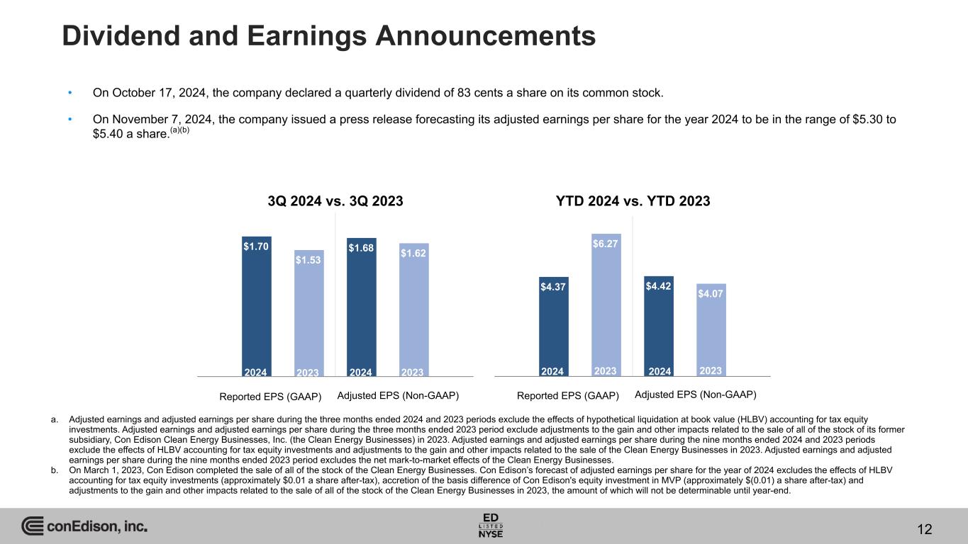 Dividend and Earnings Announcements • On October 17, 2024, the company declared a quarterly dividend of 83 cents a share on its common stock. • On November 7, 2024, the company issued a press release forecasting its adjusted earnings per share for the year 2024 to be in the range of $5.30 to $5.40 a share.(a)(b) Reported EPS (GAAP) Adjusted EPS (Non-GAAP) $1.70 $1.53 $1.68 $1.62 2024 2023 2024 2023 3Q 2024 vs. 3Q 2023 a. Adjusted earnings and adjusted earnings per share during the three months ended 2024 and 2023 periods exclude the effects of hypothetical liquidation at book value (HLBV) accounting for tax equity investments. Adjusted earnings and adjusted earnings per share during the three months ended 2023 period exclude adjustments to the gain and other impacts related to the sale of all of the stock of its former subsidiary, Con Edison Clean Energy Businesses, Inc. (the Clean Energy Businesses) in 2023. Adjusted earnings and adjusted earnings per share during the nine months ended 2024 and 2023 periods exclude the effects of HLBV accounting for tax equity investments and adjustments to the gain and other impacts related to the sale of the Clean Energy Businesses in 2023. Adjusted earnings and adjusted earnings per share during the nine months ended 2023 period excludes the net mark-to-market effects of the Clean Energy Businesses. b. On March 1, 2023, Con Edison completed the sale of all of the stock of the Clean Energy Businesses. Con Edison’s forecast of adjusted earnings per share for the year of 2024 excludes the effects of HLBV accounting for tax equity investments (approximately $0.01 a share after-tax), accretion of the basis difference of Con Edison's equity investment in MVP (approximately $(0.01) a share after-tax) and adjustments to the gain and other impacts related to the sale of all of the stock of the Clean Energy Businesses in 2023, the amount of which will not be determinable until year-end. Reported EPS (GAAP) Adjusted EPS (Non-GAAP) $4.37 $6.27 $4.42 $4.07 2024 2023 2024 2023 YTD 2024 vs. YTD 2023 12