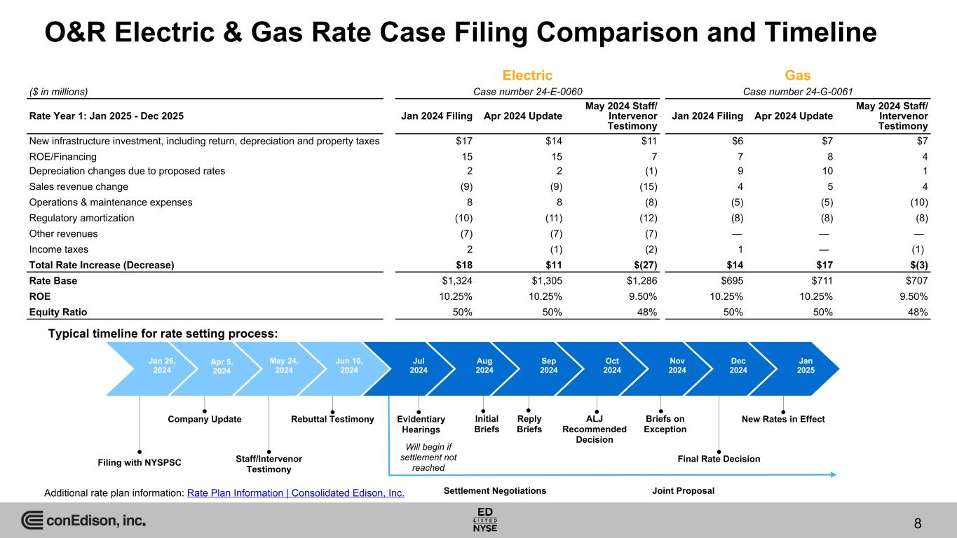 Additional rate plan information: Rate Plan Information | Consolidated Edison, Inc. Typical timeline for rate setting process: Jan 26, 2024 Apr 5, 2024 May 24, 2024 Jun 10, 2024 Jul 2024 Aug 2024 Sep 2024 Oct 2024 Nov 2024 Dec 2024 Jan 2025 Filing with NYSPSC Company Update Staff/Intervenor Testimony Rebuttal Testimony Evidentiary Hearings Final Rate Decision New Rates in EffectInitial Briefs Reply Briefs ALJ Recommended Decision Briefs on Exception Settlement Negotiations Joint Proposal O&R Electric & Gas Rate Case Filing Comparison and Timeline 8 Electric Gas ($ in millions) Case number 24-E-0060 Case number 24-G-0061 Rate Year 1: Jan 2025 - Dec 2025 Jan 2024 Filing Apr 2024 Update May 2024 Staff/ Intervenor Testimony Jan 2024 Filing Apr 2024 Update May 2024 Staff/ Intervenor Testimony New infrastructure investment, including return, depreciation and property taxes $17 $14 $11 $6 $7 $7 ROE/Financing 15 15 7 7 8 4 Depreciation changes due to proposed rates 2 2 (1) 9 10 1 Sales revenue change (9) (9) (15) 4 5 4 Operations & maintenance expenses 8 8 (8) (5) (5) (10) Regulatory amortization (10) (11) (12) (8) (8) (8) Other revenues (7) (7) (7) — — — Income taxes 2 (1) (2) 1 — (1) Total Rate Increase (Decrease) $18 $11 $(27) $14 $17 $(3) Rate Base $1,324 $1,305 $1,286 $695 $711 $707 ROE 10.25% 10.25% 9.50% 10.25% 10.25% 9.50% Equity Ratio 50% 50% 48% 50% 50% 48% Will begin if settlement not reached