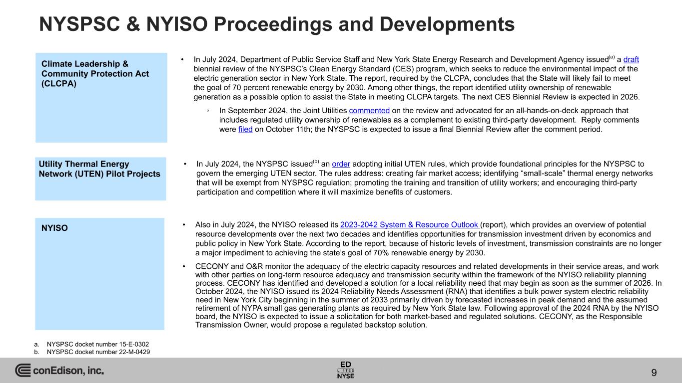 NYSPSC & NYISO Proceedings and Developments NYISO 9 a. NYSPSC docket number 15-E-0302 b. NYSPSC docket number 22-M-0429 Climate Leadership & Community Protection Act (CLCPA) Utility Thermal Energy Network (UTEN) Pilot Projects • In July 2024, Department of Public Service Staff and New York State Energy Research and Development Agency issued(a) a draft biennial review of the NYSPSC’s Clean Energy Standard (CES) program, which seeks to reduce the environmental impact of the electric generation sector in New York State. The report, required by the CLCPA, concludes that the State will likely fail to meet the goal of 70 percent renewable energy by 2030. Among other things, the report identified utility ownership of renewable generation as a possible option to assist the State in meeting CLCPA targets. The next CES Biennial Review is expected in 2026. ◦ In September 2024, the Joint Utilities commented on the review and advocated for an all-hands-on-deck approach that includes regulated utility ownership of renewables as a complement to existing third-party development. Reply comments were filed on October 11th; the NYSPSC is expected to issue a final Biennial Review after the comment period. • In July 2024, the NYSPSC issued(b) an order adopting initial UTEN rules, which provide foundational principles for the NYSPSC to govern the emerging UTEN sector. The rules address: creating fair market access; identifying “small-scale” thermal energy networks that will be exempt from NYSPSC regulation; promoting the training and transition of utility workers; and encouraging third-party participation and competition where it will maximize benefits of customers. • Also in July 2024, the NYISO released its 2023-2042 System & Resource Outlook (report), which provides an overview of potential resource developments over the next two decades and identifies opportunities for transmission investment driven by economics and public policy in New York State. According to the report, because of historic levels of investment, transmission constraints are no longer a major impediment to achieving the state’s goal of 70% renewable energy by 2030. • CECONY and O&R monitor the adequacy of the electric capacity resources and related developments in their service areas, and work with other parties on long-term resource adequacy and transmission security within the framework of the NYISO reliability planning process. CECONY has identified and developed a solution for a local reliability need that may begin as soon as the summer of 2026. In October 2024, the NYISO issued its 2024 Reliability Needs Assessment (RNA) that identifies a bulk power system electric reliability need in New York City beginning in the summer of 2033 primarily driven by forecasted increases in peak demand and the assumed retirement of NYPA small gas generating plants as required by New York State law. Following approval of the 2024 RNA by the NYISO board, the NYISO is expected to issue a solicitation for both market-based and regulated solutions. CECONY, as the Responsible Transmission Owner, would propose a regulated backstop solution.