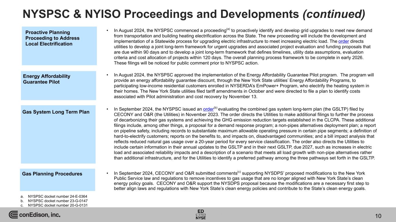 NYSPSC & NYISO Proceedings and Developments (continued) 10 a. NYSPSC docket number 24-E-0364 b. NYSPSC docket number 23-G-0147 c. NYSPSC docket number 20-G-0131 Gas System Long Term Plan • In September 2024, the NYSPSC issued an order(b) evaluating the combined gas system long-term plan (the GSLTP) filed by CECONY and O&R (the Utilities) in November 2023. The order directs the Utilities to make additional filings to further the process of decarbonizing their gas systems and achieving the GHG emission reduction targets established in the CLCPA. These additional filings include, among other things, a proposal for a demand response program; a non-pipes alternatives deployment plan; a report on pipeline safety, including records to substantiate maximum allowable operating pressure in certain pipe segments; a definition of hard-to-electrify customers; reports on the benefits to, and impacts on, disadvantaged communities; and a bill impact analysis that reflects reduced natural gas usage over a 20-year period for every service classification. The order also directs the Utilities to include certain information in their annual updates to the GSLTP and in their next GSLTP, due 2027, such as increases in electric load and associated reliability impacts and a description of a scenario that meets all load growth with non-pipe alternatives rather than additional infrastructure, and for the Utilities to identify a preferred pathway among the three pathways set forth in the GSLTP. Energy Affordability Guarantee Pilot • In August 2024, the NYSPSC approved the implementation of the Energy Affordability Guarantee Pilot program. The program will provide an energy affordability guarantee discount, through the New York State utilities’ Energy Affordability Programs, to participating low-income residential customers enrolled in NYSERDA’s EmPower+ Program, who electrify the heating system in their homes. The New York State utilities filed tariff amendments in October and were directed to file a plan to identify costs associated with Pilot administration and cost recovery by November 13. Proactive Planning Proceeding to Address Local Electrification • In August 2024, the NYSPSC commenced a proceeding(a) to proactively identify and develop grid upgrades to meet new demand from transportation and building heating electrification across the State. The new proceeding will include the development and implementation of a Statewide process for upgrading electric infrastructure to meet increasing electric load. The order directs utilities to develop a joint long-term framework for urgent upgrades and associated project evaluation and funding proposals that are due within 90 days and to develop a joint long-term framework that defines timelines, utility data assumptions, evaluation criteria and cost allocation of projects within 120 days. The overall planning process framework to be complete in early 2026. These filings will be noticed for public comment prior to NYSPSC action. Gas Planning Procedures • In September 2024, CECONY and O&R submitted comments(c) supporting NYSDPS’ proposed modifications to the New York Public Service law and regulations to remove incentives to gas usage that are no longer aligned with New York State’s clean energy policy goals. CECONY and O&R support the NYSDPS proposal because the modifications are a necessary first step to better align laws and regulations with New York State’s clean energy policies and contribute to the State’s clean energy goals.