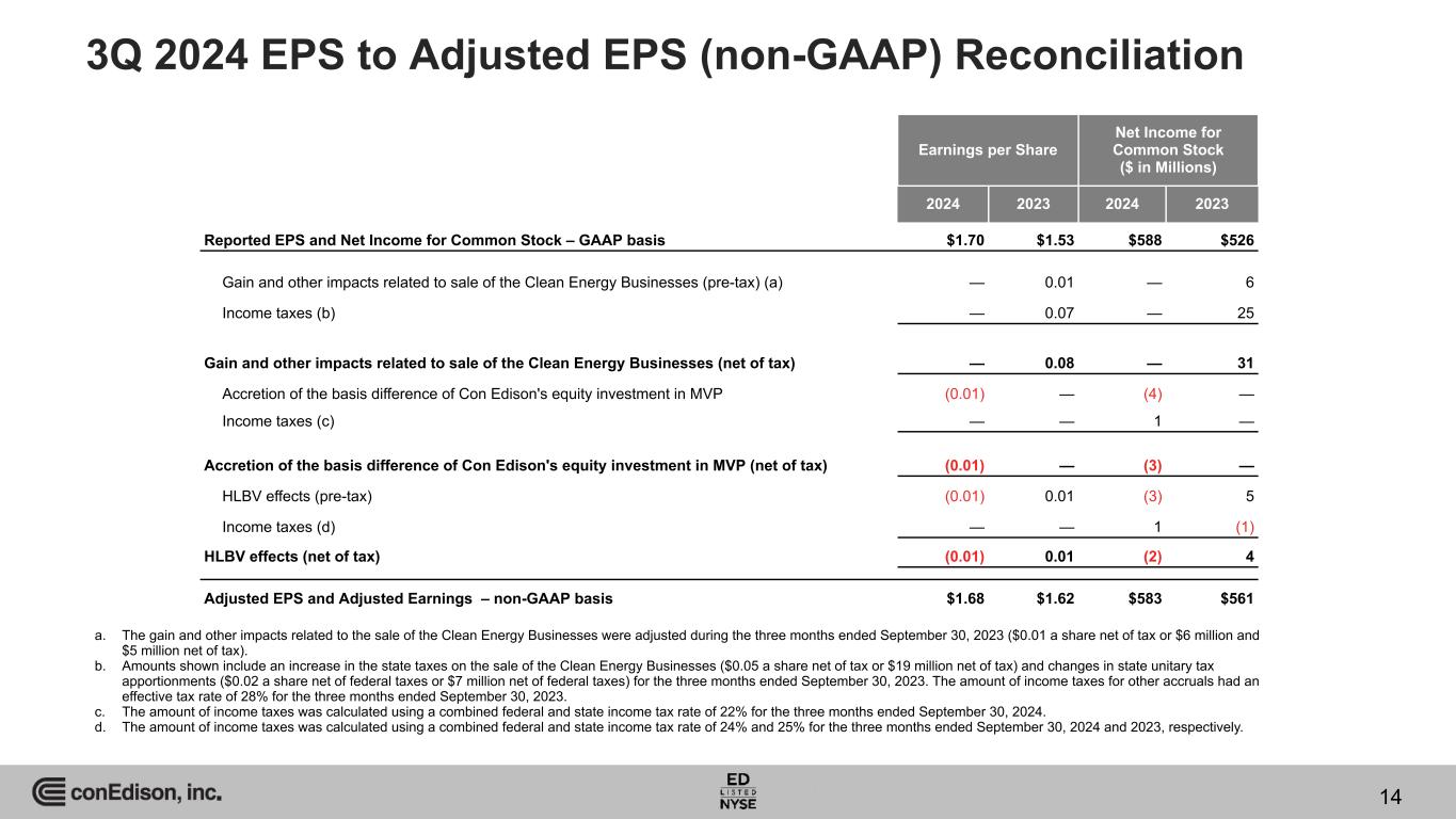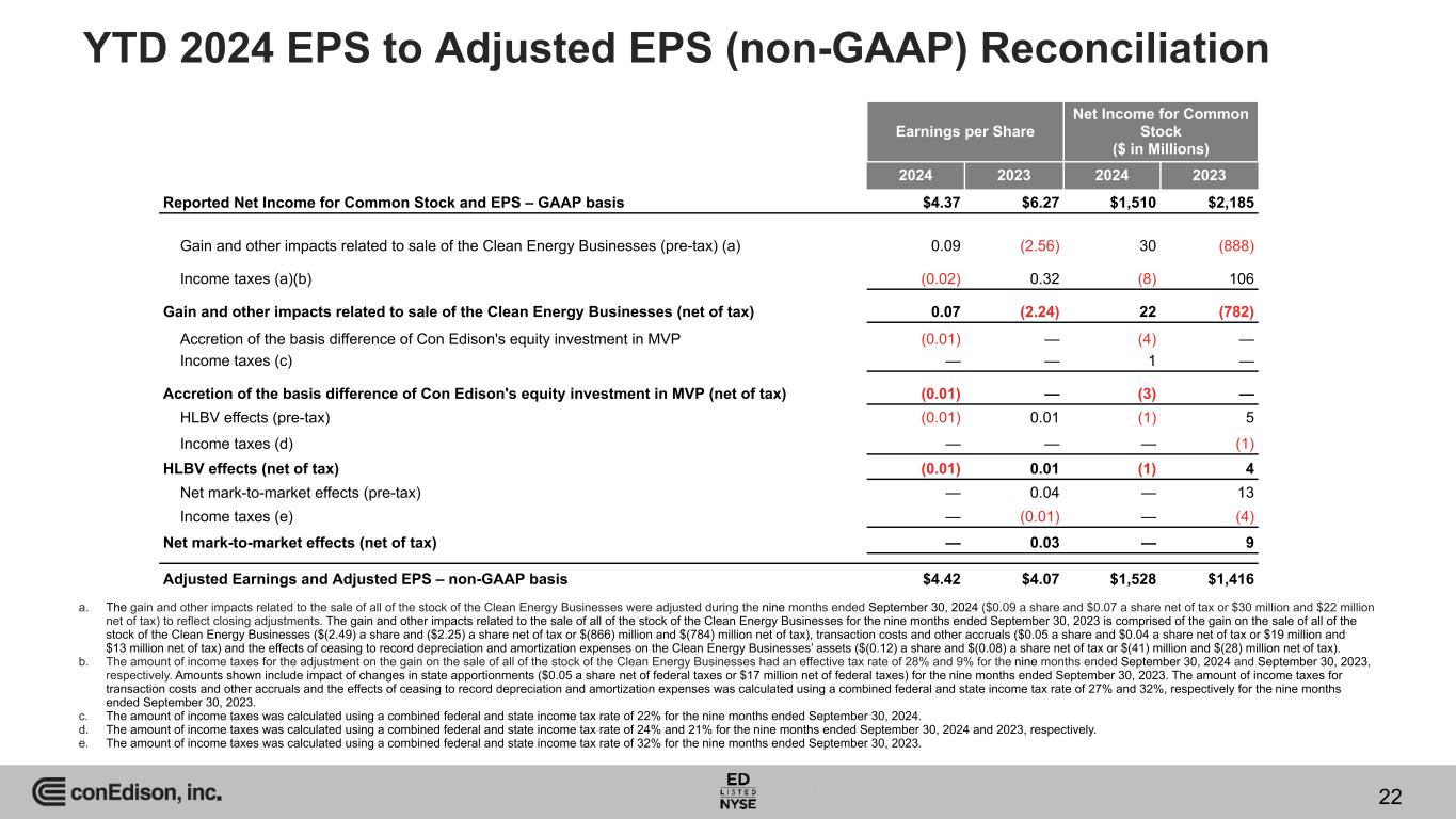 YTD 2024 EPS to Adjusted EPS (non-GAAP) Reconciliation Earnings per Share Net Income for Common Stock ($ in Millions) 2024 2023 2024 2023 Reported Net Income for Common Stock and EPS – GAAP basis $4.37 $6.27 $1,510 $2,185 Gain and other impacts related to sale of the Clean Energy Businesses (pre-tax) (a) 0.09 (2.56) 30 (888) Income taxes (a)(b) (0.02) 0.32 (8) 106 Gain and other impacts related to sale of the Clean Energy Businesses (net of tax) 0.07 (2.24) 22 (782) Accretion of the basis difference of Con Edison's equity investment in MVP (0.01) — (4) — Income taxes (c) — — 1 — Accretion of the basis difference of Con Edison's equity investment in MVP (net of tax) (0.01) — (3) — HLBV effects (pre-tax) (0.01) 0.01 (1) 5 Income taxes (d) — — — (1) HLBV effects (net of tax) (0.01) 0.01 (1) 4 Net mark-to-market effects (pre-tax) — 0.04 — 13 Income taxes (e) — (0.01) — (4) Net mark-to-market effects (net of tax) — 0.03 — 9 Adjusted Earnings and Adjusted EPS – non-GAAP basis $4.42 $4.07 $1,528 $1,416 a. The gain and other impacts related to the sale of all of the stock of the Clean Energy Businesses were adjusted during the nine months ended September 30, 2024 ($0.09 a share and $0.07 a share net of tax or $30 million and $22 million net of tax) to reflect closing adjustments. The gain and other impacts related to the sale of all of the stock of the Clean Energy Businesses for the nine months ended September 30, 2023 is comprised of the gain on the sale of all of the stock of the Clean Energy Businesses ($(2.49) a share and ($2.25) a share net of tax or $(866) million and $(784) million net of tax), transaction costs and other accruals ($0.05 a share and $0.04 a share net of tax or $19 million and $13 million net of tax) and the effects of ceasing to record depreciation and amortization expenses on the Clean Energy Businesses’ assets ($(0.12) a share and $(0.08) a share net of tax or $(41) million and $(28) million net of tax). b. The amount of income taxes for the adjustment on the gain on the sale of all of the stock of the Clean Energy Businesses had an effective tax rate of 28% and 9% for the nine months ended September 30, 2024 and September 30, 2023, respectively. Amounts shown include impact of changes in state apportionments ($0.05 a share net of federal taxes or $17 million net of federal taxes) for the nine months ended September 30, 2023. The amount of income taxes for transaction costs and other accruals and the effects of ceasing to record depreciation and amortization expenses was calculated using a combined federal and state income tax rate of 27% and 32%, respectively for the nine months ended September 30, 2023. c. The amount of income taxes was calculated using a combined federal and state income tax rate of 22% for the nine months ended September 30, 2024. d. The amount of income taxes was calculated using a combined federal and state income tax rate of 24% and 21% for the nine months ended September 30, 2024 and 2023, respectively. e. The amount of income taxes was calculated using a combined federal and state income tax rate of 32% for the nine months ended September 30, 2023. 22
