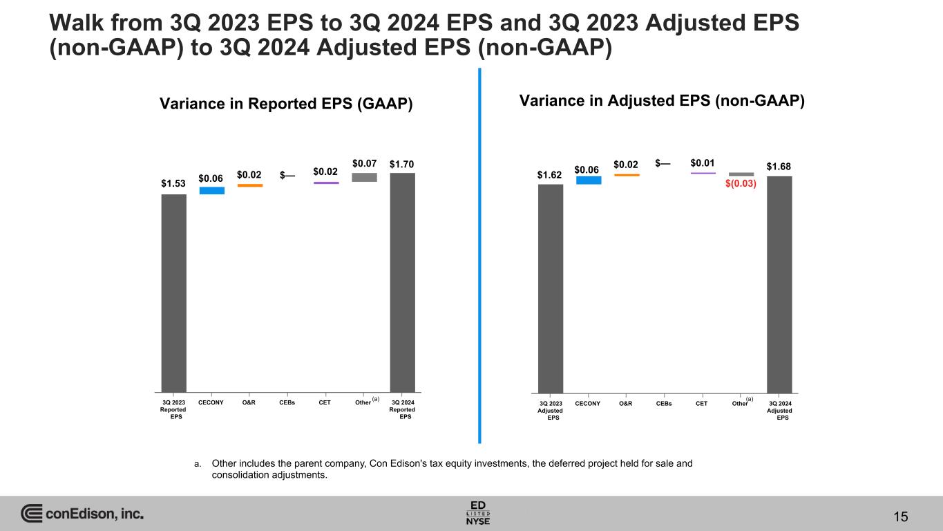 3Q 2024 EPS to Adjusted EPS (non-GAAP) Reconciliation Earnings per Share Net Income for Common Stock ($ in Millions) 2024 2023 2024 2023 Reported EPS and Net Income for Common Stock – GAAP basis $1.70 $1.53 $588 $526 Gain and other impacts related to sale of the Clean Energy Businesses (pre-tax) (a) — 0.01 — 6 Income taxes (b) — 0.07 — 25 Gain and other impacts related to sale of the Clean Energy Businesses (net of tax) — 0.08 — 31 Accretion of the basis difference of Con Edison's equity investment in MVP (0.01) — (4) — Income taxes (c) — — 1 — Accretion of the basis difference of Con Edison's equity investment in MVP (net of tax) (0.01) — (3) — HLBV effects (pre-tax) (0.01) 0.01 (3) 5 Income taxes (d) — — 1 (1) HLBV effects (net of tax) (0.01) 0.01 (2) 4 Adjusted EPS and Adjusted Earnings – non-GAAP basis $1.68 $1.62 $583 $561 a. The gain and other impacts related to the sale of the Clean Energy Businesses were adjusted during the three months ended September 30, 2023 ($0.01 a share net of tax or $6 million and $5 million net of tax). b. Amounts shown include an increase in the state taxes on the sale of the Clean Energy Businesses ($0.05 a share net of tax or $19 million net of tax) and changes in state unitary tax apportionments ($0.02 a share net of federal taxes or $7 million net of federal taxes) for the three months ended September 30, 2023. The amount of income taxes for other accruals had an effective tax rate of 28% for the three months ended September 30, 2023. c. The amount of income taxes was calculated using a combined federal and state income tax rate of 22% for the three months ended September 30, 2024. d. The amount of income taxes was calculated using a combined federal and state income tax rate of 24% and 25% for the three months ended September 30, 2024 and 2023, respectively. 14