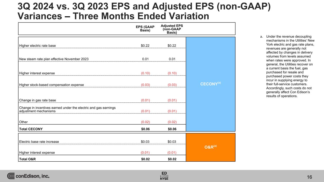 Variance in Reported EPS (GAAP) Variance in Adjusted EPS (non-GAAP) 3Q 2023 Reported EPS CECONY O&R CEBs CET Other 3Q 2024 Reported EPS $1.53 $0.06 $0.02 $— $0.02 $1.70 3Q 2023 Adjusted EPS CECONY O&R CEBs CET Other 3Q 2024 Adjusted EPS $1.62 $0.06 $0.02 $(0.03) $1.68 $— (a) (a) $0.01 $0.07 a. Other includes the parent company, Con Edison's tax equity investments, the deferred project held for sale and consolidation adjustments. Walk from 3Q 2023 EPS to 3Q 2024 EPS and 3Q 2023 Adjusted EPS (non-GAAP) to 3Q 2024 Adjusted EPS (non-GAAP) 15