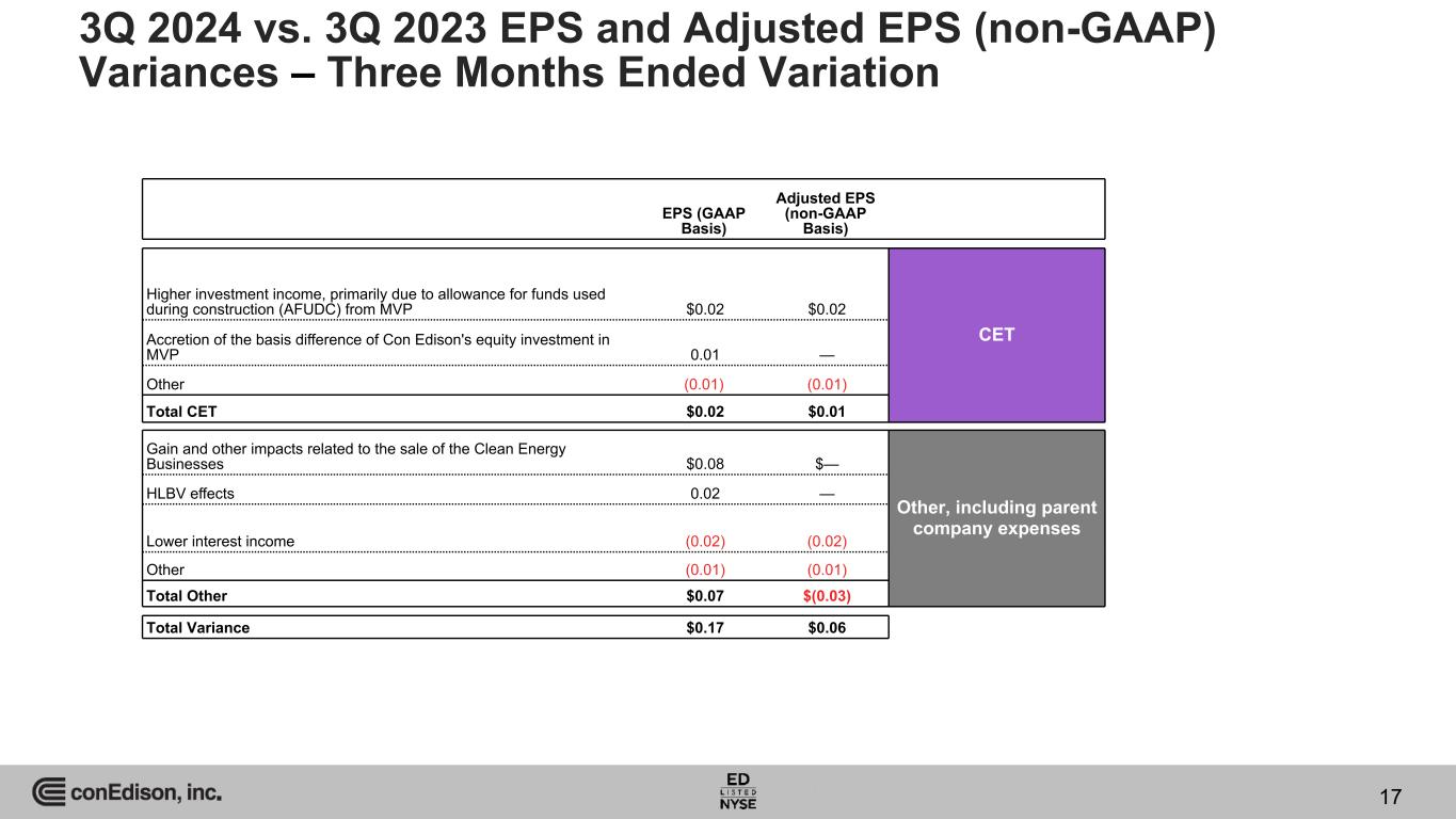 EPS (GAAP Basis) Adjusted EPS (non-GAAP Basis) Higher electric rate base $0.22 $0.22 CECONY(a) New steam rate plan effective November 2023 0.01 0.01 Higher interest expense (0.10) (0.10) Higher stock-based compensation expense (0.03) (0.03) Change in gas rate base (0.01) (0.01) Change in incentives earned under the electric and gas earnings adjustment mechanisms (0.01) (0.01) Other (0.02) (0.02) Total CECONY $0.06 $0.06 Electric base rate increase $0.03 $0.03 O&R(a) Higher interest expense (0.01) (0.01) Total O&R $0.02 $0.02 3Q 2024 vs. 3Q 2023 EPS and Adjusted EPS (non-GAAP) Variances – Three Months Ended Variation a. Under the revenue decoupling mechanisms in the Utilities’ New York electric and gas rate plans, revenues are generally not affected by changes in delivery volumes from levels assumed when rates were approved. In general, the Utilities recover on a current basis the fuel, gas purchased for resale and purchased power costs they incur in supplying energy to their full-service customers. Accordingly, such costs do not generally affect Con Edison’s results of operations. 16