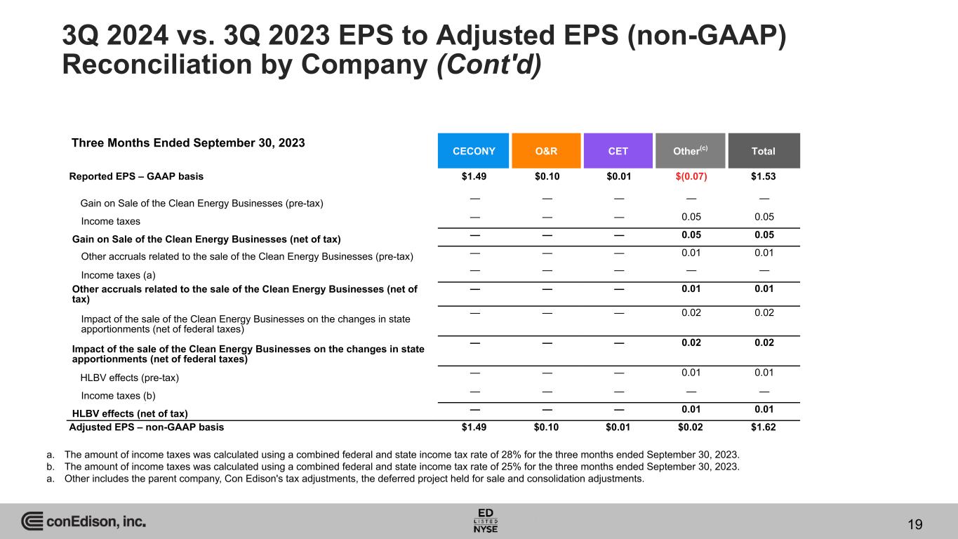 3Q 2024 vs. 3Q 2023 EPS to Adjusted EPS (non-GAAP) Reconciliation by Company CECONY O&R CET Other(c) Total Reported EPS – GAAP basis $1.55 $0.12 $0.03 $— $1.70 HLBV effects (pre-tax) — — — (0.01) (0.01) Income taxes (a) — — — — — HLBV effects (net of tax) — — — (0.01) (0.01) Accretion of the basis difference of Con Edison's equity investment in MVP — — (0.01) — (0.01) Income taxes (b) — — — — — Accretion of the basis difference of Con Edison's equity investment in MVP (net of tax) — — (0.01) — (0.01) Adjusted EPS – non-GAAP basis $1.55 $0.12 $0.02 $(0.01) $1.68 Three Months Ended September 30, 2024 a. The amount of income taxes was calculated using a combined federal and state income tax rate of 24% for the three months ended September 30, 2024. b. The amount of income taxes was calculated using a combined federal and state income tax rate of 22% for the three months ended September 30, 2024. c. Other includes the parent company, Con Edison's tax adjustments, the deferred project held for sale and consolidation adjustments. 18