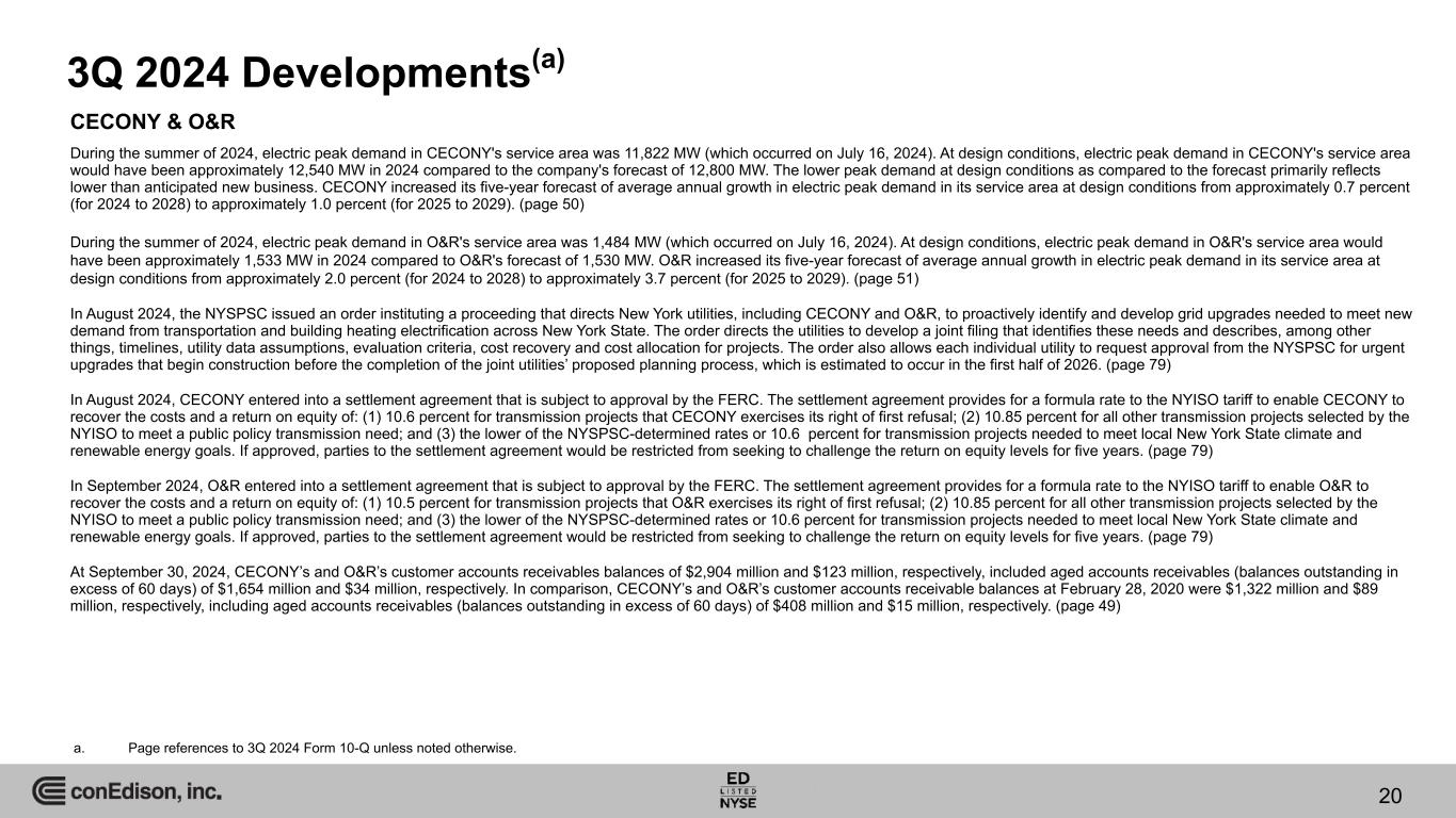 3Q 2024 Developments(a) CECONY & O&R During the summer of 2024, electric peak demand in CECONY's service area was 11,822 MW (which occurred on July 16, 2024). At design conditions, electric peak demand in CECONY's service area would have been approximately 12,540 MW in 2024 compared to the company's forecast of 12,800 MW. The lower peak demand at design conditions as compared to the forecast primarily reflects lower than anticipated new business. CECONY increased its five-year forecast of average annual growth in electric peak demand in its service area at design conditions from approximately 0.7 percent (for 2024 to 2028) to approximately 1.0 percent (for 2025 to 2029). (page 50) During the summer of 2024, electric peak demand in O&R's service area was 1,484 MW (which occurred on July 16, 2024). At design conditions, electric peak demand in O&R's service area would have been approximately 1,533 MW in 2024 compared to O&R's forecast of 1,530 MW. O&R increased its five-year forecast of average annual growth in electric peak demand in its service area at design conditions from approximately 2.0 percent (for 2024 to 2028) to approximately 3.7 percent (for 2025 to 2029). (page 51) In August 2024, the NYSPSC issued an order instituting a proceeding that directs New York utilities, including CECONY and O&R, to proactively identify and develop grid upgrades needed to meet new demand from transportation and building heating electrification across New York State. The order directs the utilities to develop a joint filing that identifies these needs and describes, among other things, timelines, utility data assumptions, evaluation criteria, cost recovery and cost allocation for projects. The order also allows each individual utility to request approval from the NYSPSC for urgent upgrades that begin construction before the completion of the joint utilities’ proposed planning process, which is estimated to occur in the first half of 2026. (page 79) In August 2024, CECONY entered into a settlement agreement that is subject to approval by the FERC. The settlement agreement provides for a formula rate to the NYISO tariff to enable CECONY to recover the costs and a return on equity of: (1) 10.6 percent for transmission projects that CECONY exercises its right of first refusal; (2) 10.85 percent for all other transmission projects selected by the NYISO to meet a public policy transmission need; and (3) the lower of the NYSPSC-determined rates or 10.6 percent for transmission projects needed to meet local New York State climate and renewable energy goals. If approved, parties to the settlement agreement would be restricted from seeking to challenge the return on equity levels for five years. (page 79) In September 2024, O&R entered into a settlement agreement that is subject to approval by the FERC. The settlement agreement provides for a formula rate to the NYISO tariff to enable O&R to recover the costs and a return on equity of: (1) 10.5 percent for transmission projects that O&R exercises its right of first refusal; (2) 10.85 percent for all other transmission projects selected by the NYISO to meet a public policy transmission need; and (3) the lower of the NYSPSC-determined rates or 10.6 percent for transmission projects needed to meet local New York State climate and renewable energy goals. If approved, parties to the settlement agreement would be restricted from seeking to challenge the return on equity levels for five years. (page 79) At September 30, 2024, CECONY’s and O&R’s customer accounts receivables balances of $2,904 million and $123 million, respectively, included aged accounts receivables (balances outstanding in excess of 60 days) of $1,654 million and $34 million, respectively. In comparison, CECONY’s and O&R’s customer accounts receivable balances at February 28, 2020 were $1,322 million and $89 million, respectively, including aged accounts receivables (balances outstanding in excess of 60 days) of $408 million and $15 million, respectively. (page 49) a. Page references to 3Q 2024 Form 10-Q unless noted otherwise. 20