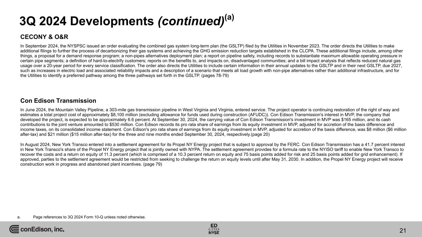 3Q 2024 Developments (continued)(a) a. Page references to 3Q 2024 Form 10-Q unless noted otherwise. 21 CECONY & O&R In September 2024, the NYSPSC issued an order evaluating the combined gas system long-term plan (the GSLTP) filed by the Utilities in November 2023. The order directs the Utilities to make additional filings to further the process of decarbonizing their gas systems and achieving the GHG emission reduction targets established in the CLCPA. These additional filings include, among other things, a proposal for a demand response program; a non-pipes alternatives deployment plan; a report on pipeline safety, including records to substantiate maximum allowable operating pressure in certain pipe segments; a definition of hard-to-electrify customers; reports on the benefits to, and impacts on, disadvantaged communities; and a bill impact analysis that reflects reduced natural gas usage over a 20-year period for every service classification. The order also directs the Utilities to include certain information in their annual updates to the GSLTP and in their next GSLTP, due 2027, such as increases in electric load and associated reliability impacts and a description of a scenario that meets all load growth with non-pipe alternatives rather than additional infrastructure, and for the Utilities to identify a preferred pathway among the three pathways set forth in the GSLTP. (pages 78-79) Con Edison Transmission In June 2024, the Mountain Valley Pipeline, a 303-mile gas transmission pipeline in West Virginia and Virginia, entered service. The project operator is continuing restoration of the right of way and estimates a total project cost of approximately $8,100 million (excluding allowance for funds used during construction (AFUDC)). Con Edison Transmission's interest in MVP, the company that developed the project, is expected to be approximately 6.6 percent. At September 30, 2024, the carrying value of Con Edison Transmission's investment in MVP was $165 million, and its cash contributions to the joint venture amounted to $530 million. Con Edison records its pro rata share of earnings from its equity investment in MVP, adjusted for accretion of the basis difference and income taxes, on its consolidated income statement. Con Edison's pro rata share of earnings from its equity investment in MVP, adjusted for accretion of the basis difference, was $8 million ($6 million after-tax) and $21 million ($15 million after-tax) for the three and nine months ended September 30, 2024, respectively.(page 20) In August 2024, New York Transco entered into a settlement agreement for its Propel NY Energy project that is subject to approval by the FERC. Con Edison Transmission has a 41.7 percent interest in New York Transco's share of the Propel NY Energy project that is jointly owned with NYPA. The settlement agreement provides for a formula rate to the NYISO tariff to enable New York Transco to recover the costs and a return on equity of 11.3 percent (which is comprised of a 10.3 percent return on equity and 75 basis points added for risk and 25 basis points added for grid enhancement). If approved, parties to the settlement agreement would be restricted from seeking to challenge the return on equity levels until after May 31, 2030. In addition, the Propel NY Energy project will receive construction work in progress and abandoned plant incentives. (page 79)