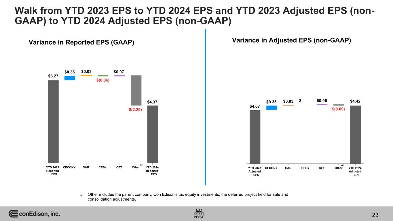 YTD 2023 Adjusted EPS CECONY O&R CEBs CET Other YTD 2024 Adjusted EPS Variance in Reported EPS (GAAP) Variance in Adjusted EPS (non-GAAP) YTD 2023 Reported EPS CECONY O&R CEBs CET Other YTD 2024 Reported EPS $6.27 $0.35 $0.03 $(0.06) $0.07 $(2.29) $4.37 $4.07 $0.35 $0.03 $— $0.06 $(0.09) $4.42 (a) (a) a. Other includes the parent company, Con Edison's tax equity investments, the deferred project held for sale and consolidation adjustments. Walk from YTD 2023 EPS to YTD 2024 EPS and YTD 2023 Adjusted EPS (non- GAAP) to YTD 2024 Adjusted EPS (non-GAAP) 23