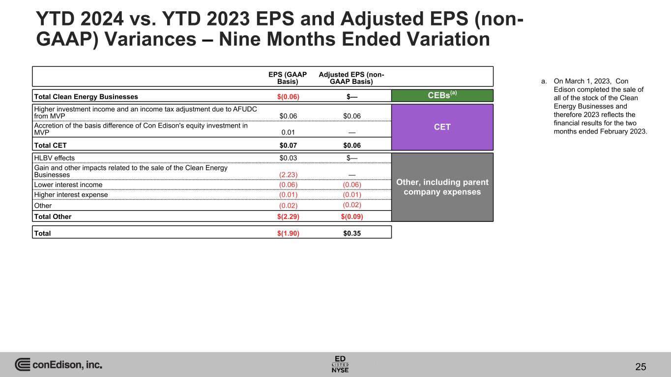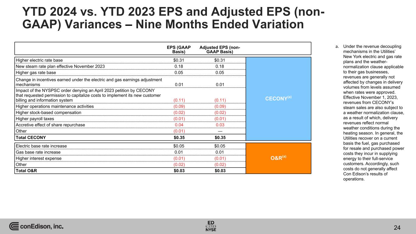 EPS (GAAP Basis) Adjusted EPS (non- GAAP Basis) Higher electric rate base $0.31 $0.31 CECONY(a) New steam rate plan effective November 2023 0.18 0.18 Higher gas rate base 0.05 0.05 Change in incentives earned under the electric and gas earnings adjustment mechanisms 0.01 0.01 Impact of the NYSPSC order denying an April 2023 petition by CECONY that requested permission to capitalize costs to implement its new customer billing and information system (0.11) (0.11) Higher operations maintenance activities (0.09) (0.09) Higher stock-based compensation (0.02) (0.02) Higher payroll taxes (0.01) (0.01) Accretive effect of share repurchase 0.04 0.03 Other (0.01) — Total CECONY $0.35 $0.35 Electric base rate increase $0.05 $0.05 O&R(a) Gas base rate increase 0.01 0.01 Higher interest expense (0.01) (0.01) Other (0.02) (0.02) Total O&R $0.03 $0.03 a. Under the revenue decoupling mechanisms in the Utilities’ New York electric and gas rate plans and the weather- normalization clause applicable to their gas businesses, revenues are generally not affected by changes in delivery volumes from levels assumed when rates were approved. Effective November 1, 2023, revenues from CECONY’s steam sales are also subject to a weather normalization clause, as a result of which, delivery revenues reflect normal weather conditions during the heating season. In general, the Utilities recover on a current basis the fuel, gas purchased for resale and purchased power costs they incur in supplying energy to their full-service customers. Accordingly, such costs do not generally affect Con Edison’s results of operations. YTD 2024 vs. YTD 2023 EPS and Adjusted EPS (non- GAAP) Variances – Nine Months Ended Variation 24
