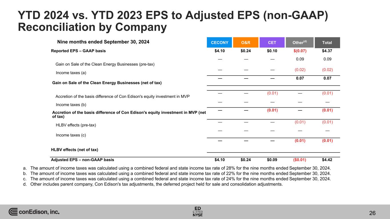EPS (GAAP Basis) Adjusted EPS (non- GAAP Basis) Total Clean Energy Businesses $(0.06) $— CEBs(a) Higher investment income and an income tax adjustment due to AFUDC from MVP $0.06 $0.06 CETAccretion of the basis difference of Con Edison's equity investment in MVP 0.01 — Total CET $0.07 $0.06 HLBV effects $0.03 $— Other, including parent company expenses Gain and other impacts related to the sale of the Clean Energy Businesses (2.23) — Lower interest income (0.06) (0.06) Higher interest expense (0.01) (0.01) Other (0.02) (0.02) Total Other $(2.29) $(0.09) Total $(1.90) $0.35 a. On March 1, 2023, Con Edison completed the sale of all of the stock of the Clean Energy Businesses and therefore 2023 reflects the financial results for the two months ended February 2023. YTD 2024 vs. YTD 2023 EPS and Adjusted EPS (non- GAAP) Variances – Nine Months Ended Variation 25