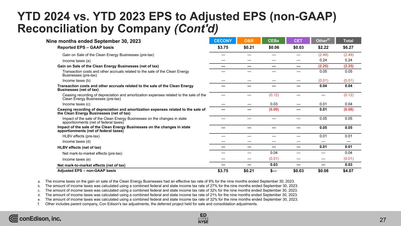 YTD 2024 vs. YTD 2023 EPS to Adjusted EPS (non-GAAP) Reconciliation by Company CECONY O&R CET Other(d) Total Reported EPS – GAAP basis $4.10 $0.24 $0.10 $(0.07) $4.37 Gain on Sale of the Clean Energy Businesses (pre-tax) — — — 0.09 0.09 Income taxes (a) — — — (0.02) (0.02) Gain on Sale of the Clean Energy Businesses (net of tax) — — — 0.07 0.07 Accretion of the basis difference of Con Edison's equity investment in MVP — — (0.01) — (0.01) Income taxes (b) — — — — — Accretion of the basis difference of Con Edison's equity investment in MVP (net of tax) — — (0.01) — (0.01) HLBV effects (pre-tax) — — — (0.01) (0.01) Income taxes (c) — — — — — HLBV effects (net of tax) — — — (0.01) (0.01) Adjusted EPS – non-GAAP basis $4.10 $0.24 $0.09 ($0.01) $4.42 Nine months ended September 30, 2024 a. The amount of income taxes was calculated using a combined federal and state income tax rate of 28% for the nine months ended September 30, 2024. b. The amount of income taxes was calculated using a combined federal and state income tax rate of 22% for the nine months ended September 30, 2024. c. The amount of income taxes was calculated using a combined federal and state income tax rate of 24% for the nine months ended September 30, 2024. d. Other includes parent company, Con Edison's tax adjustments, the deferred project held for sale and consolidation adjustments. 26